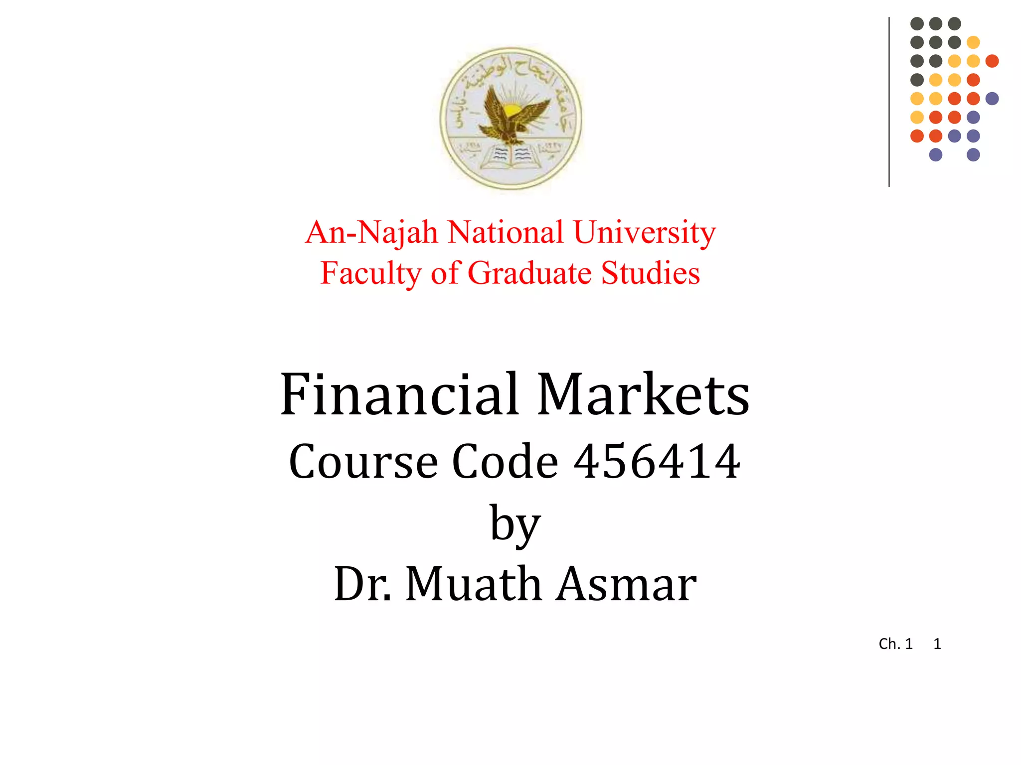 This chapter introduces key concepts about financial markets and institutions. It discusses why studying financial markets and institutions is important, as they are primary channels for allocating capital in society. The chapter defines different types of financial markets, including primary versus secondary markets, and money versus capital markets. It also introduces various financial instruments and derivative markets. Additionally, it provides an overview of different types of financial institutions and how they benefit both suppliers and users of funds. The chapter concludes with discussions around regulation of financial markets and institutions.