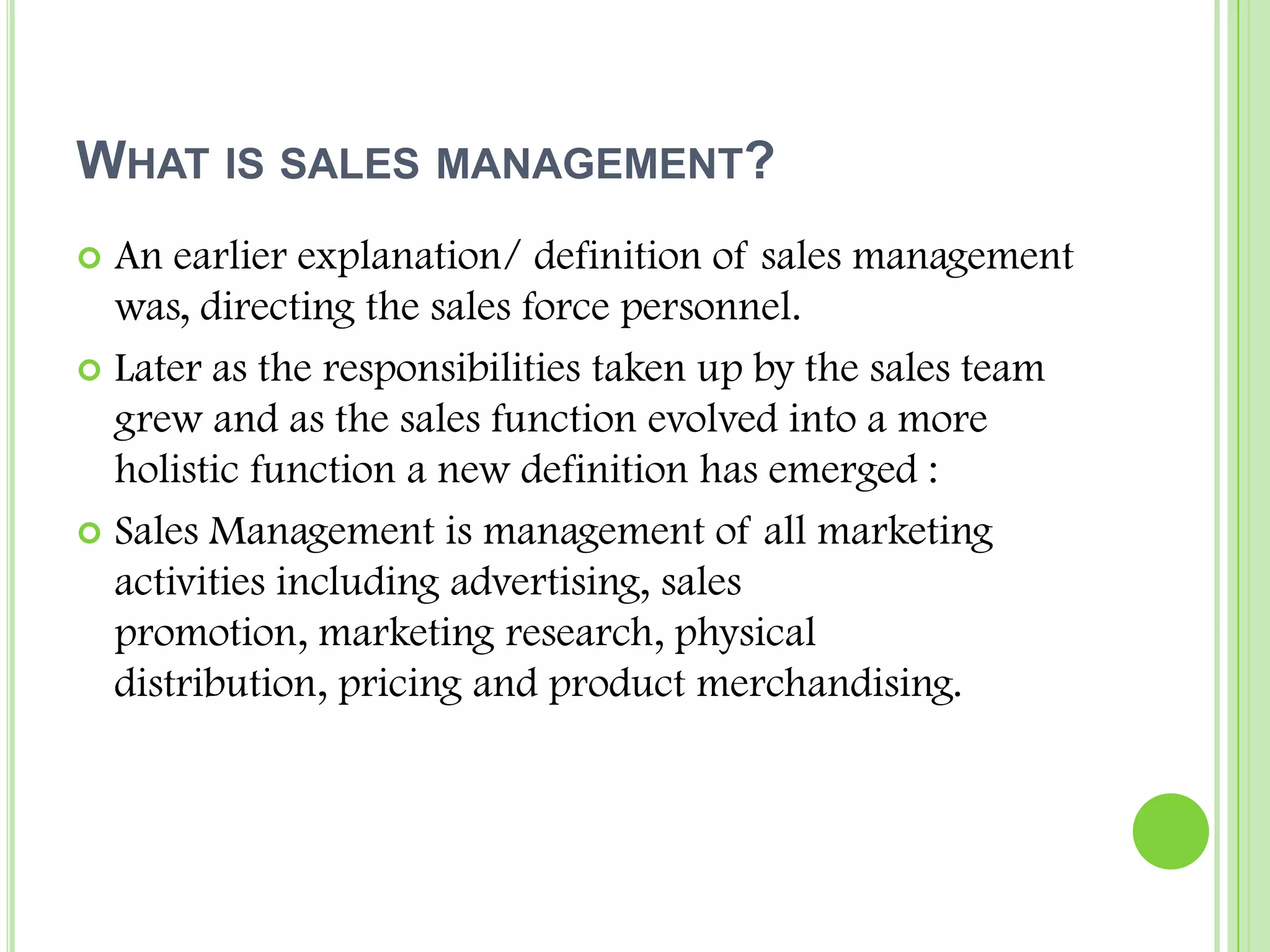 1) Sales management involves planning, directing, and controlling personnel to achieve sales goals and maximize profits. It includes recruiting, training, motivating the sales force.