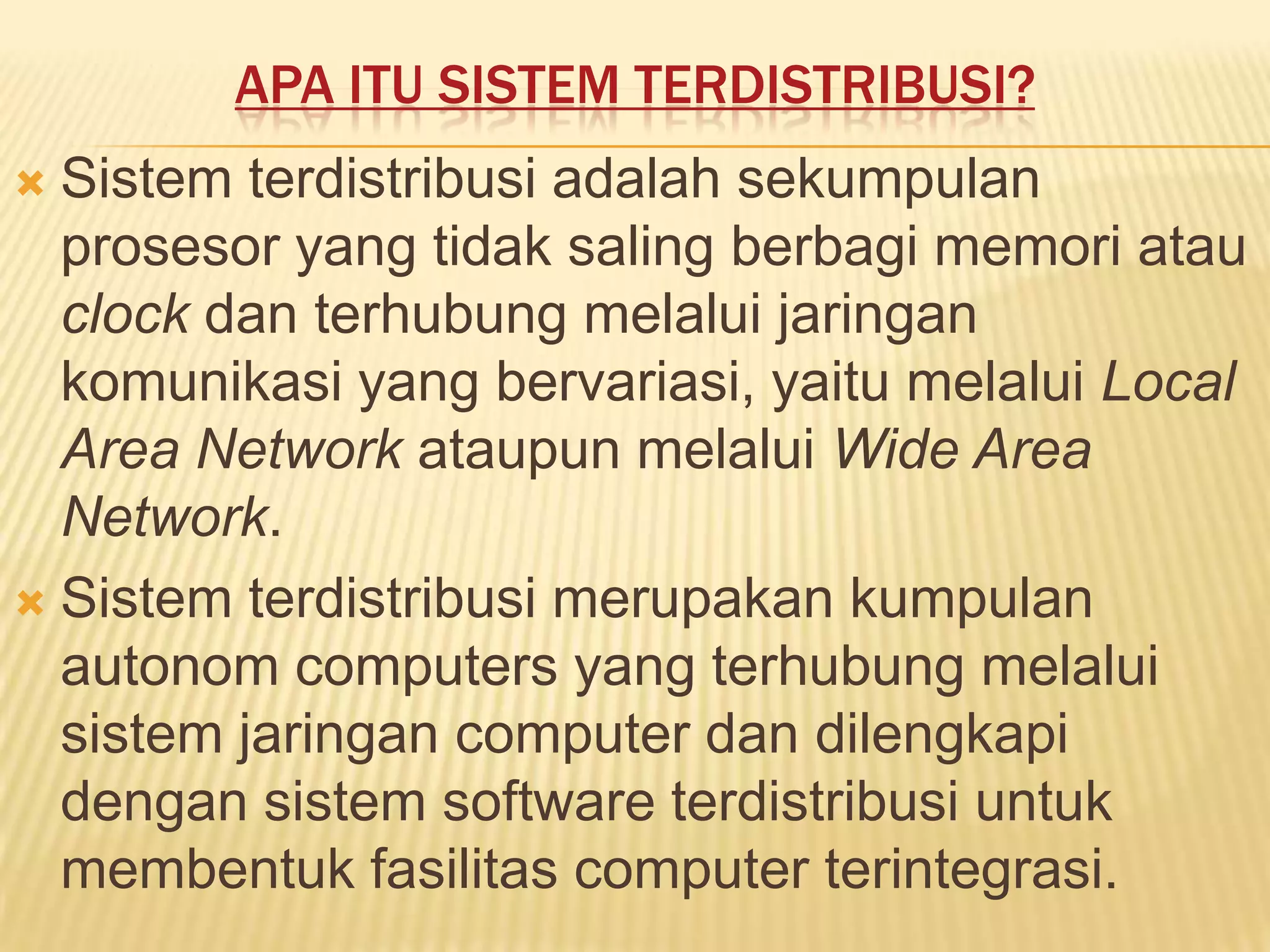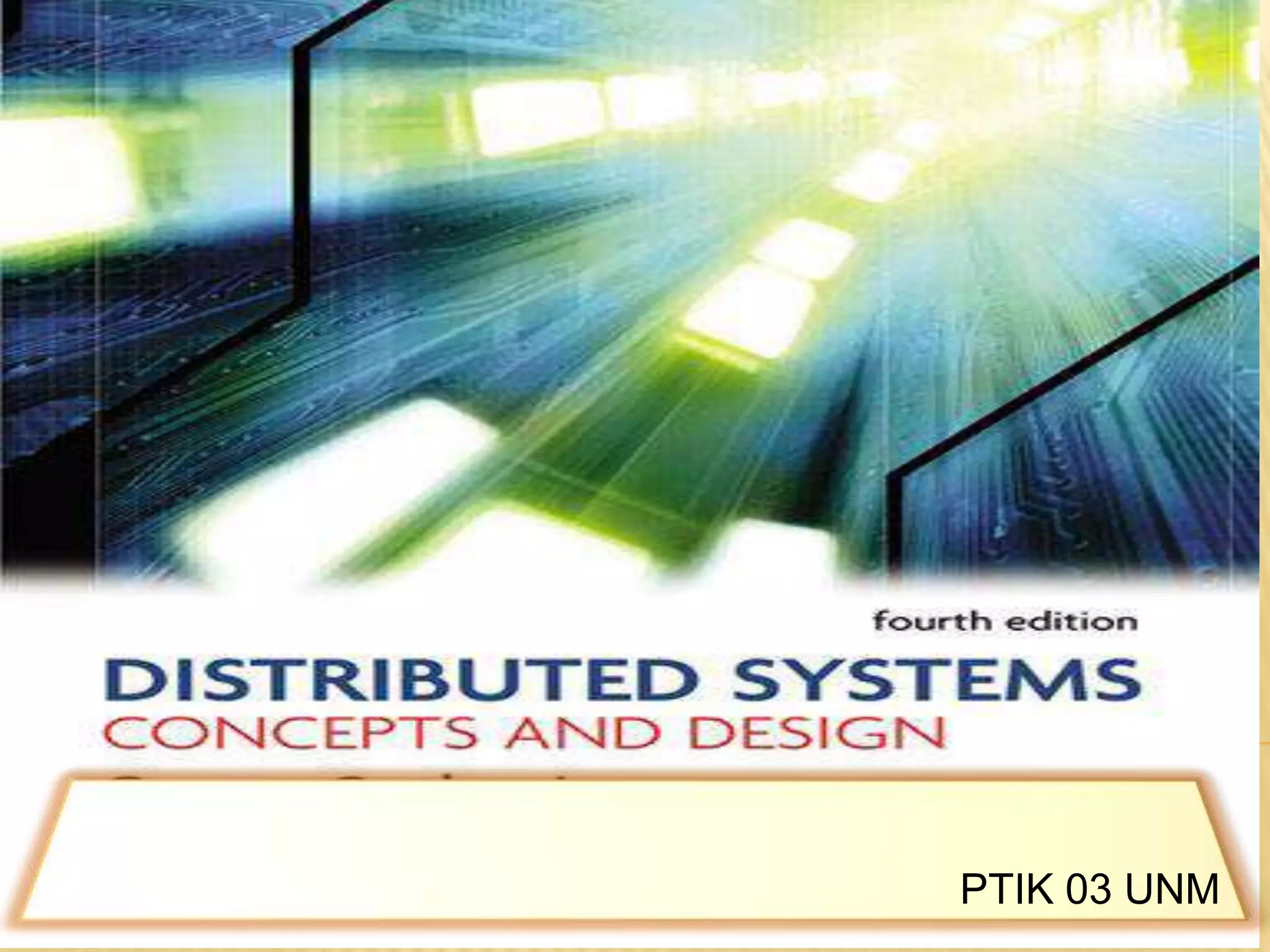 Sistem terdistribusi adalah kumpulan komputer yang tidak berbagi memori atau clock tetapi terhubung melalui jaringan untuk membentuk fasilitas komputer terintegrasi. Sistem terdistribusi bertujuan untuk menyediakan koneksi pengguna dan sumber daya, transparansi antarmuka, serta skalabilitas melalui distribusi, replikasi, dan ketersediaan layanan. Sistem terdistribusi mencakup konsep perangkat keras multiprosesor dan sistem operasi terdistribusi serta middleware