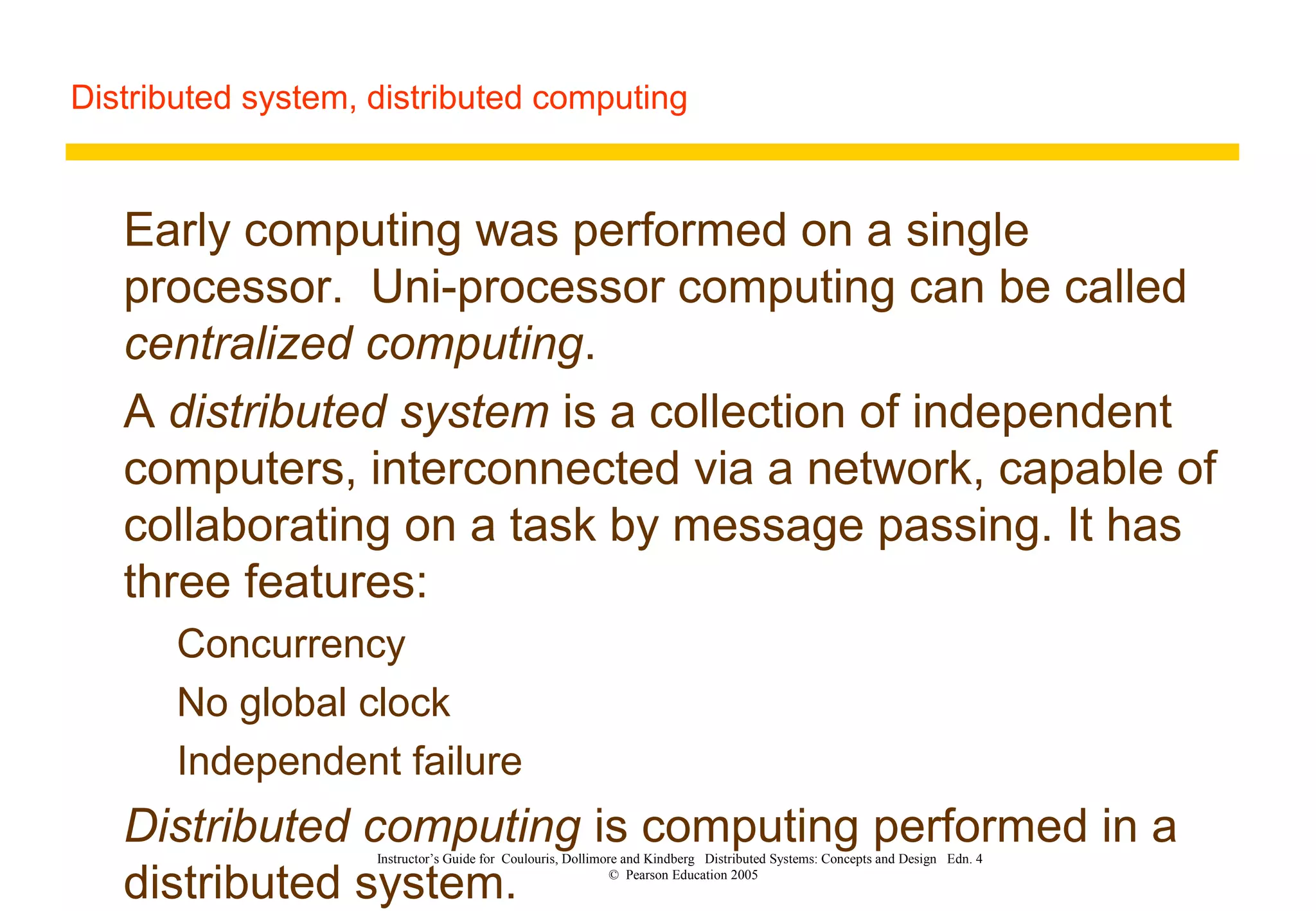 This document provides an overview of distributed systems and computing concepts through a series of slides. It defines a distributed system as a collection of independent computers interconnected via a network that can collaborate via message passing. Some key challenges of distributed computing discussed include heterogeneity, failure handling, concurrency, scalability, security, and transparency. Examples of distributed systems like web search, online games, and financial trading are provided. The document also discusses trends in distributed systems like ubiquitous networking and mobile/cloud computing.