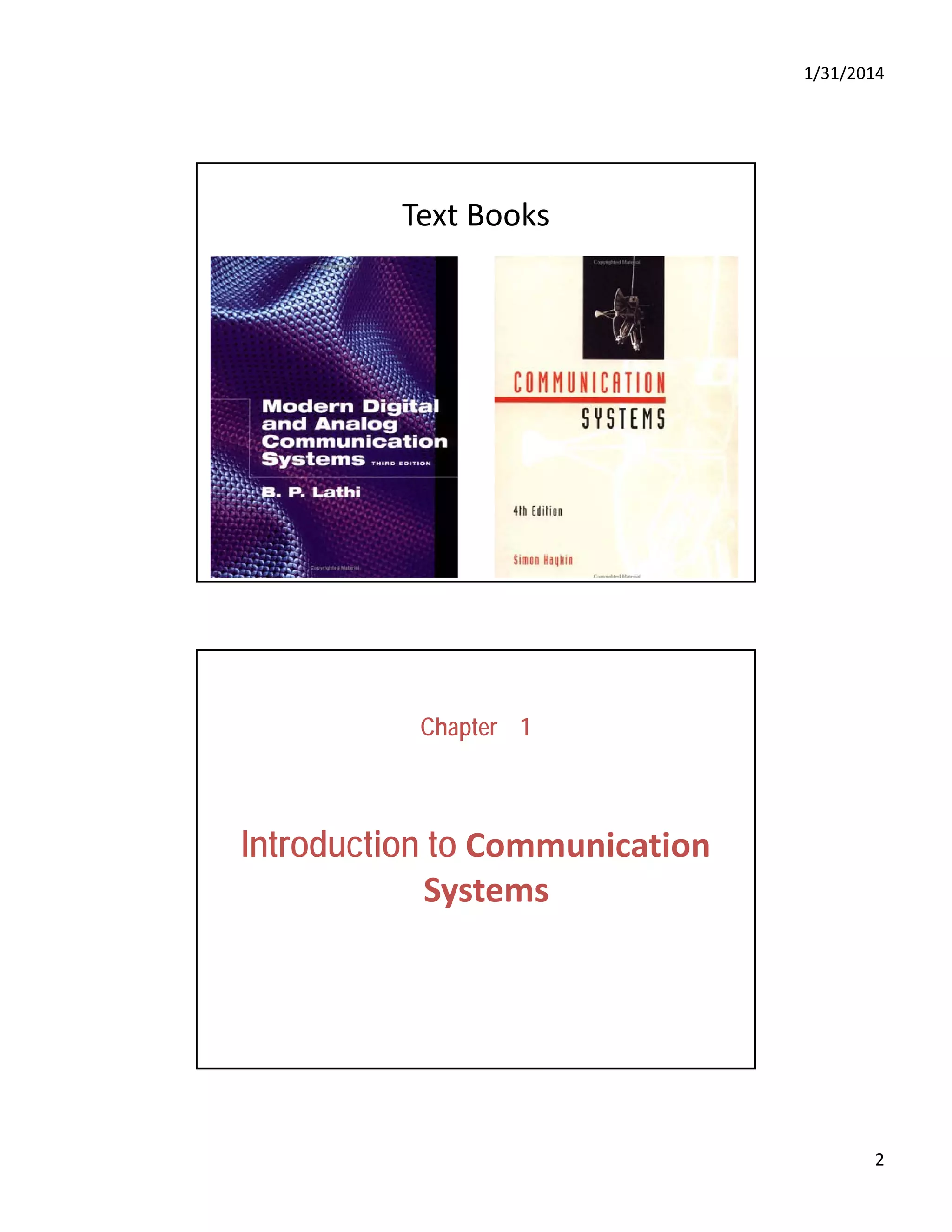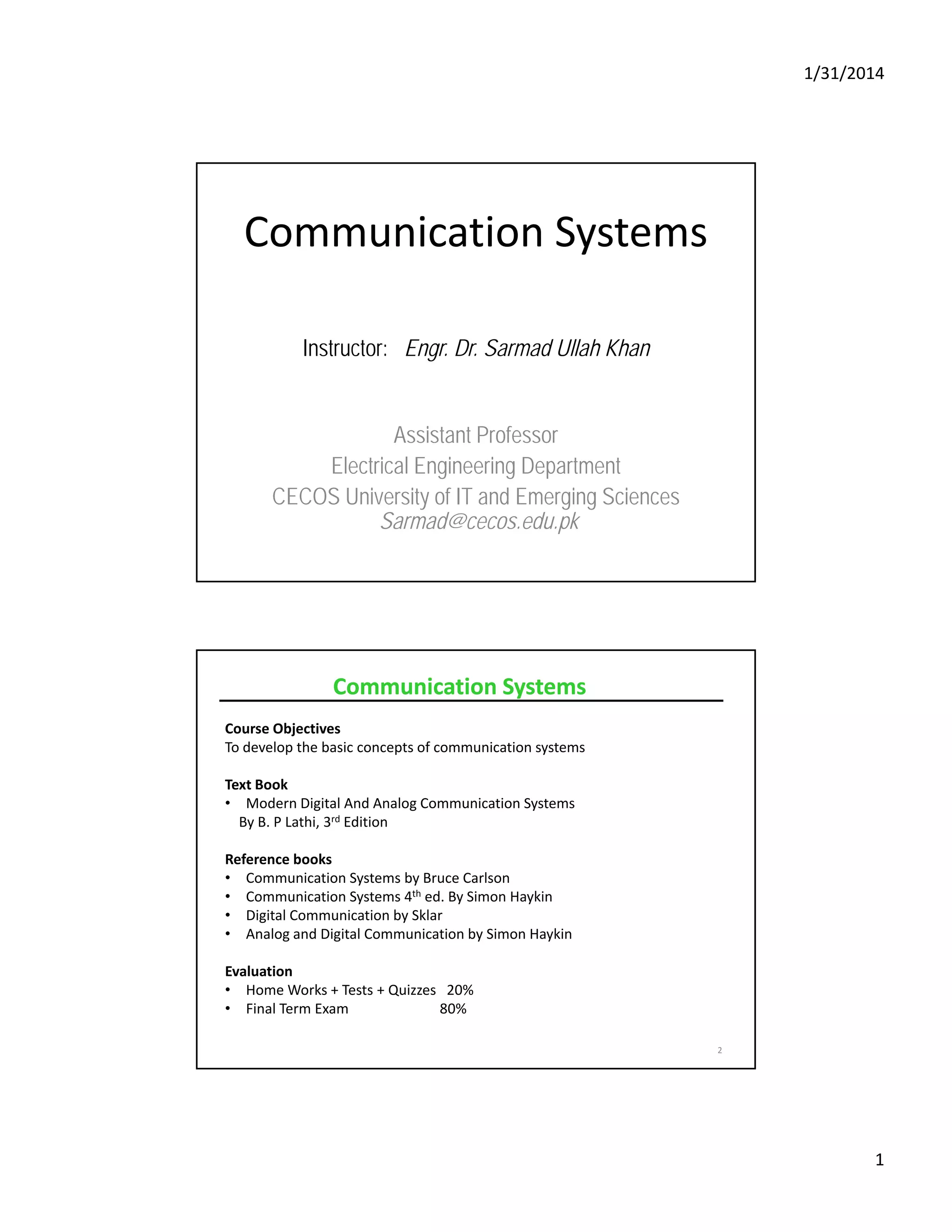 The document outlines the course objectives for a communication systems class, detailing the historical evolution of communication methods from ancient times to modern digital communication. It introduces key concepts in communication systems, including the roles of information sources, transmitters, and receivers, as well as various technical aspects such as modulation, noise, and signal compression. Additional topics covered include the comparison between analog and digital communication, and the foundational theories behind data transmission.