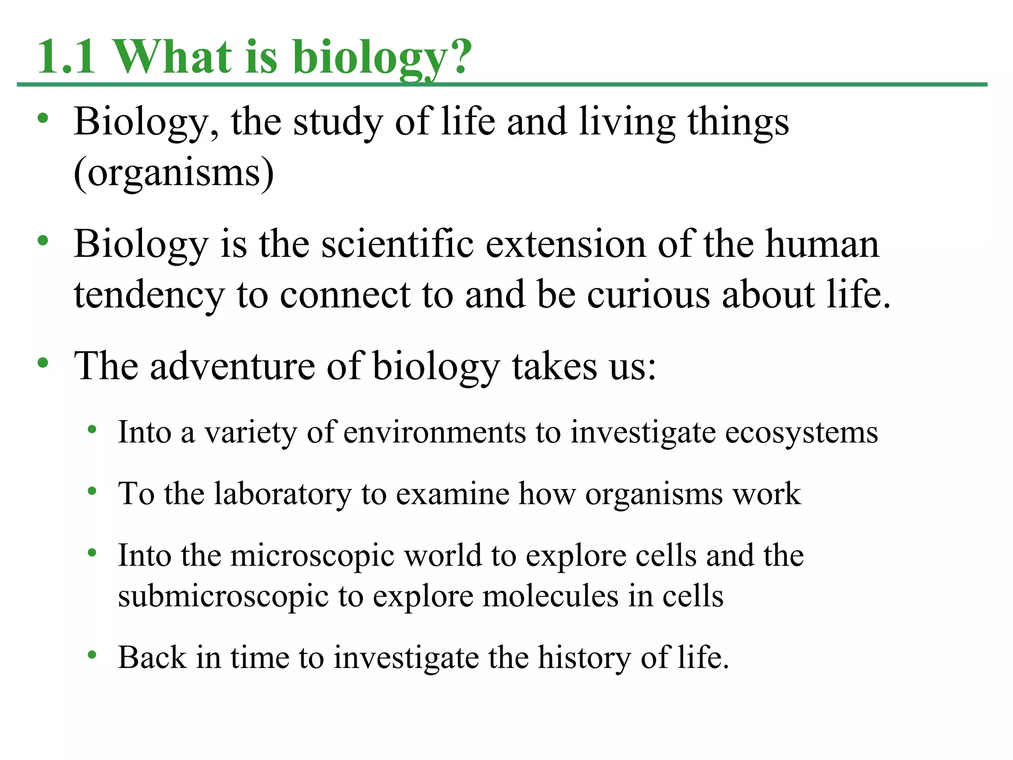 1. Biology is the study of life and living organisms, from cells to ecosystems. It explores life across environments and scales using various approaches.