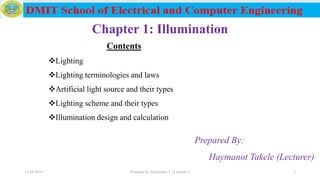 The document provides information about electrical installation and lighting. It defines electrical installation as an assembly of components that allows for the safe and reliable use of electrical power. It then discusses lighting in detail, including definitions of key lighting terms like luminous intensity and illuminance. It also covers the different types of artificial light sources, the main ones being incandescent lamps and discharge lamps. Incandescent lamps produce light through a heated filament, while discharge lamps use electric current passing through gases to produce light.
