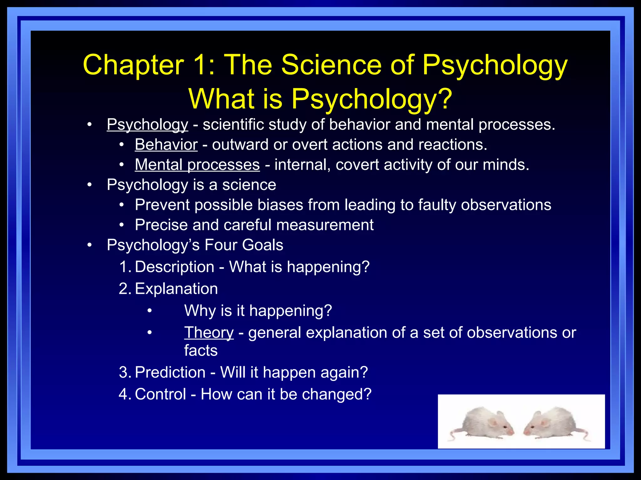 - Psychology is the scientific study of behavior and mental processes. It aims to describe, explain, predict, and control behavior and mental processes.