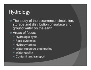 This document provides an overview of hydrology and floodplain analysis. It discusses the hydrologic cycle and key concepts in hydrology like precipitation, infiltration, evaporation and transpiration. Atmospheric processes that produce precipitation like humidity, pressure, temperature and atmospheric circulation are explained. Measurement techniques for rainfall, streamflow, infiltration and evaporation are also summarized. The role of watershed characteristics in determining how rainfall produces runoff and the hydrograph is then outlined.