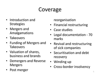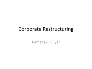 This document discusses corporate restructuring strategies. It begins by covering the different types of restructuring strategies like mergers, acquisitions, takeovers, demergers, and financial restructuring. It then discusses the need for corporate restructuring to increase efficiency and market share. The document also provides context on the regulatory framework and historical background of corporate restructuring in India. It emphasizes that strategic planning and identifying core competencies are important aspects of successfully implementing a corporate restructuring strategy.