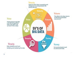 Big data is data that is too large or complex for traditional data processing applications to analyze in a timely manner. It is characterized by high volume, velocity, and variety. Big data comes from a variety of sources, including business transactions, social media, sensors, and call center notes. It can be structured, unstructured, or semi-structured. Tools used for big data include NoSQL databases, MapReduce, HDFS, and analytics platforms. Big data analytics extracts useful insights from large, diverse data sets. It has applications in various domains like healthcare, retail, and transportation.