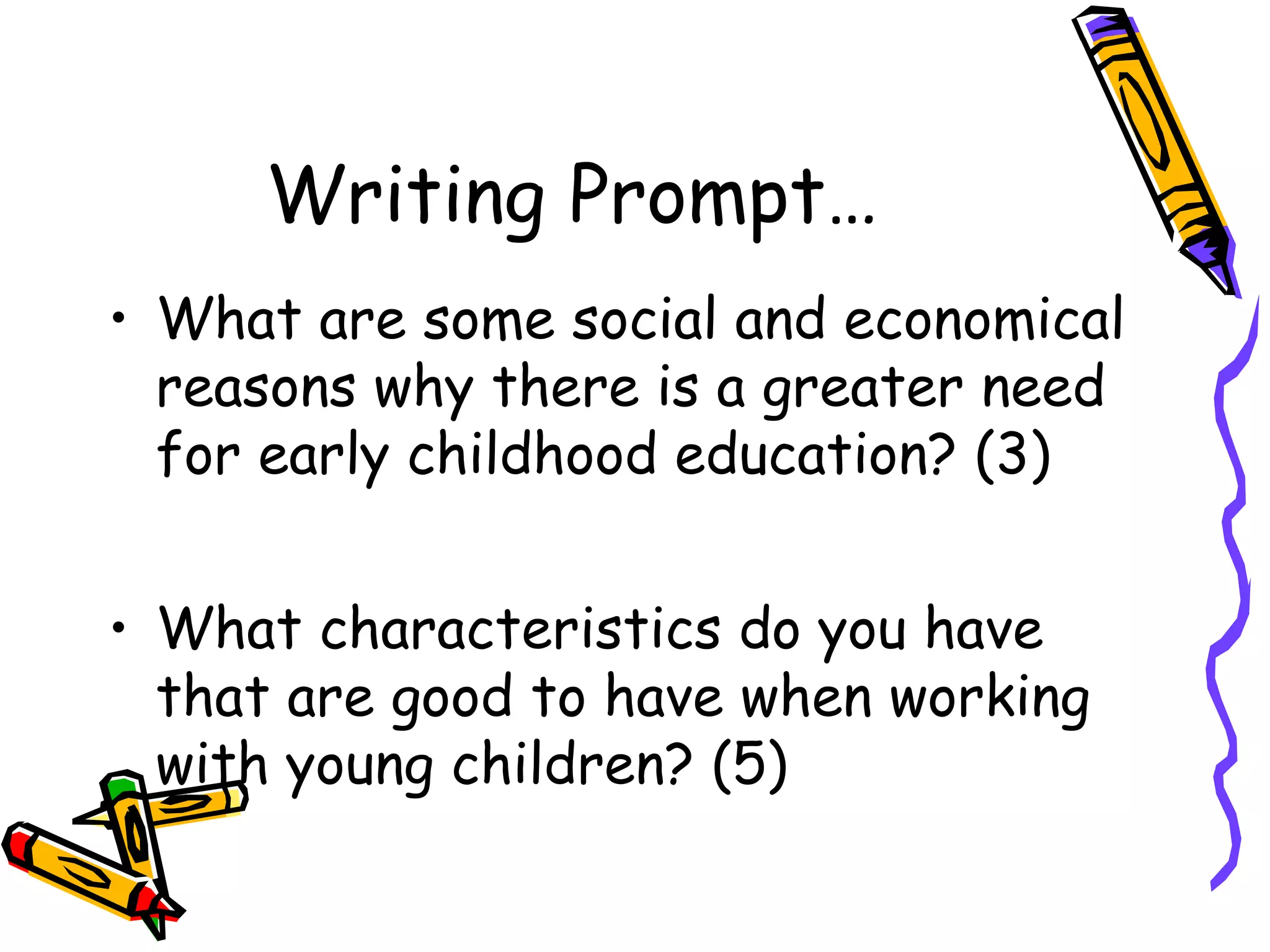 This document discusses careers working with young children and the qualifications needed. It notes that there is a greater need for early childhood education due to changing social and economic conditions like non-traditional families and employers supporting childcare. Some careers discussed include nannies, au pairs, teachers, directors, and licensing specialists. Education requirements vary but can include a Child Development Associate credential or associate's degree. Desirable teacher characteristics include fondness for children, patience, compassion, and commitment.