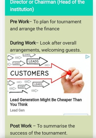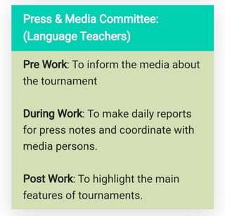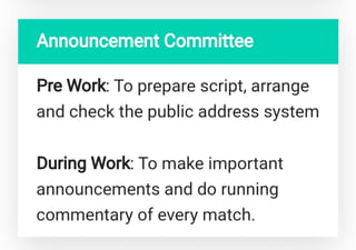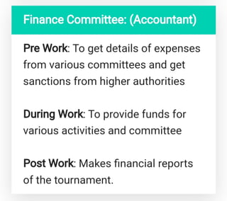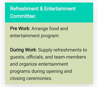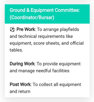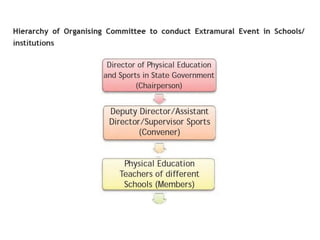 The document discusses various types and purposes of sports tournaments including knock-out, league, combination, intramural, and extramural tournaments. It also discusses the functions of sports event management such as forming committees and outlines the objectives and benefits of community sports events in bringing people together and promoting health, social, psychological, and economic gains.