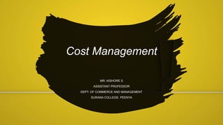 The document discusses various techniques for cost management, including cost control and cost reduction. It defines cost control as regulating costs through executive action guided by cost accounting, while cost reduction aims to permanently lower unit costs without compromising quality. Key areas covered for cost reduction are product design, target costing, value analysis, value engineering, and value chain analysis. Product design offers the greatest potential for reducing costs if considered early in development. Target costing sets target costs by subtracting desired profits from market prices. Value analysis examines components and costs to find more economical ways to achieve functions, while value engineering improves value through examining and modifying functions.