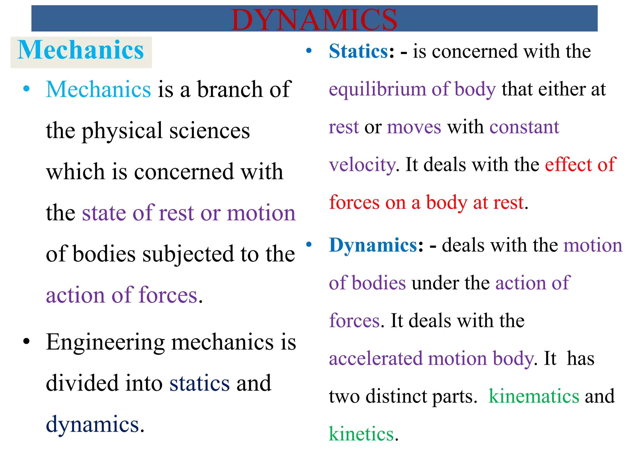 The document provides an overview of mechanics, specifically focusing on statics and dynamics within mechanical engineering. It outlines the concepts of motion, forces, kinematics, and kinetics, as well as Newton's laws of motion and gravitation. Additionally, it addresses the applications of dynamics in various fields such as robotics, transportation, and machinery.
