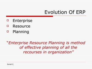 Enterprise Resource Planning (ERP) is a method for effectively planning all the resources in an organization. ERP software is designed to model and automate many basic business processes from finance to the shop floor with the goal of integrating information and eliminating complexity. ERP systems are mirror images of an organization's business processes. Some key reasons for the growth of ERP include improved business performance, supporting business growth requirements, providing flexible and integrated real-time decision support, and eliminating limitations in legacy systems.