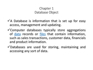 The document outlines the principles and practices for operating database applications, including the importance of database design, integrity, and relationships. It discusses various database objects, their types, and the process of creating them, emphasizing usability, extensibility, and security. Additionally, it details the normalization process for organizing data effectively and the significance of primary and foreign keys in establishing relationships between tables.