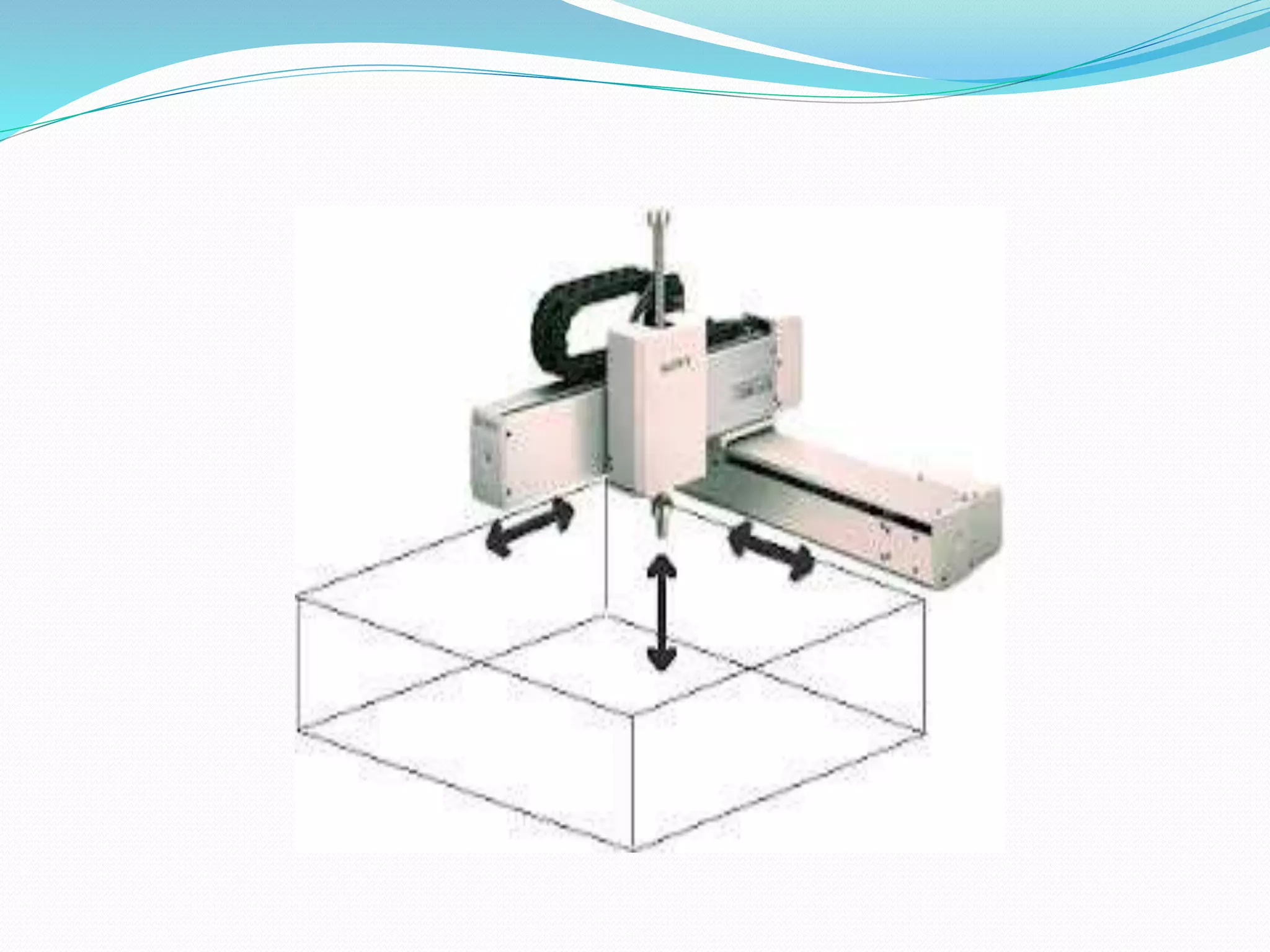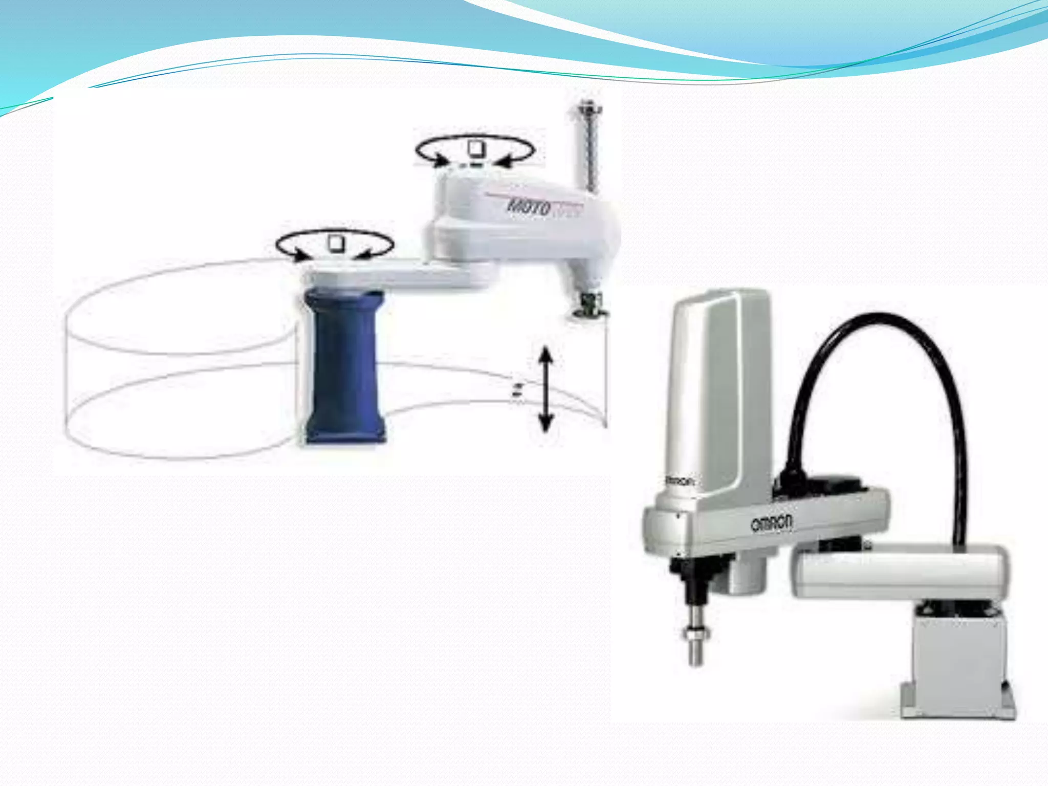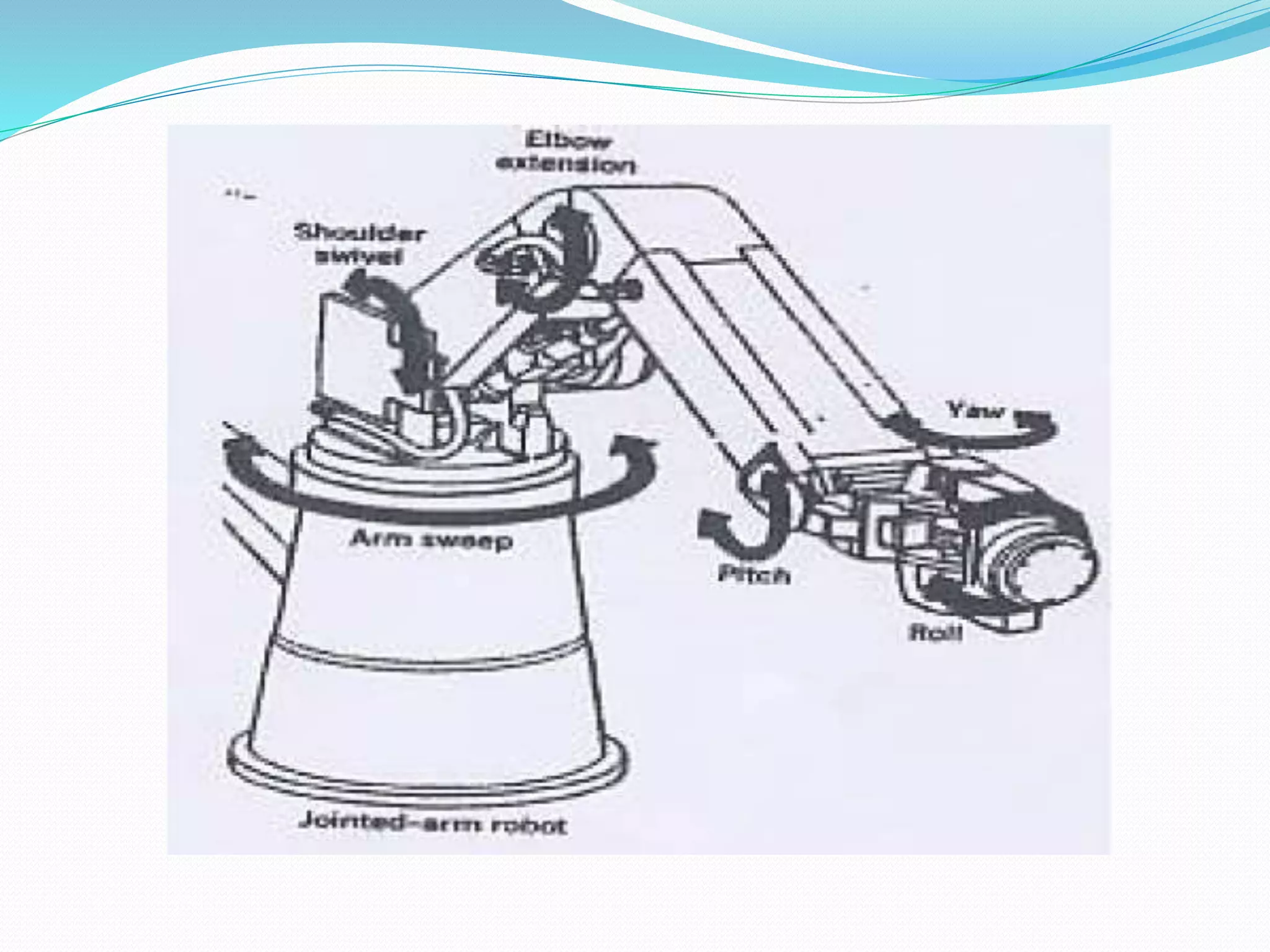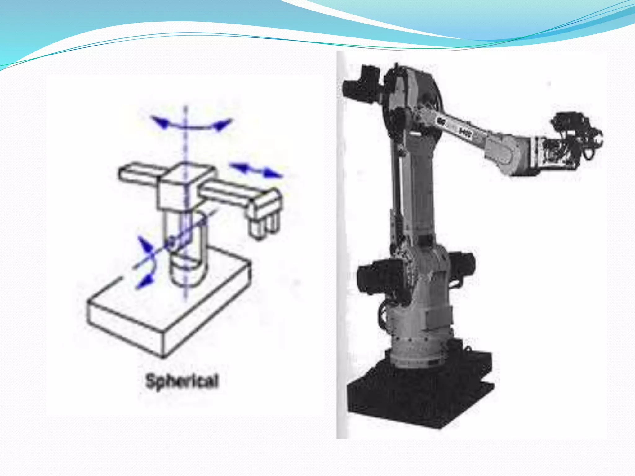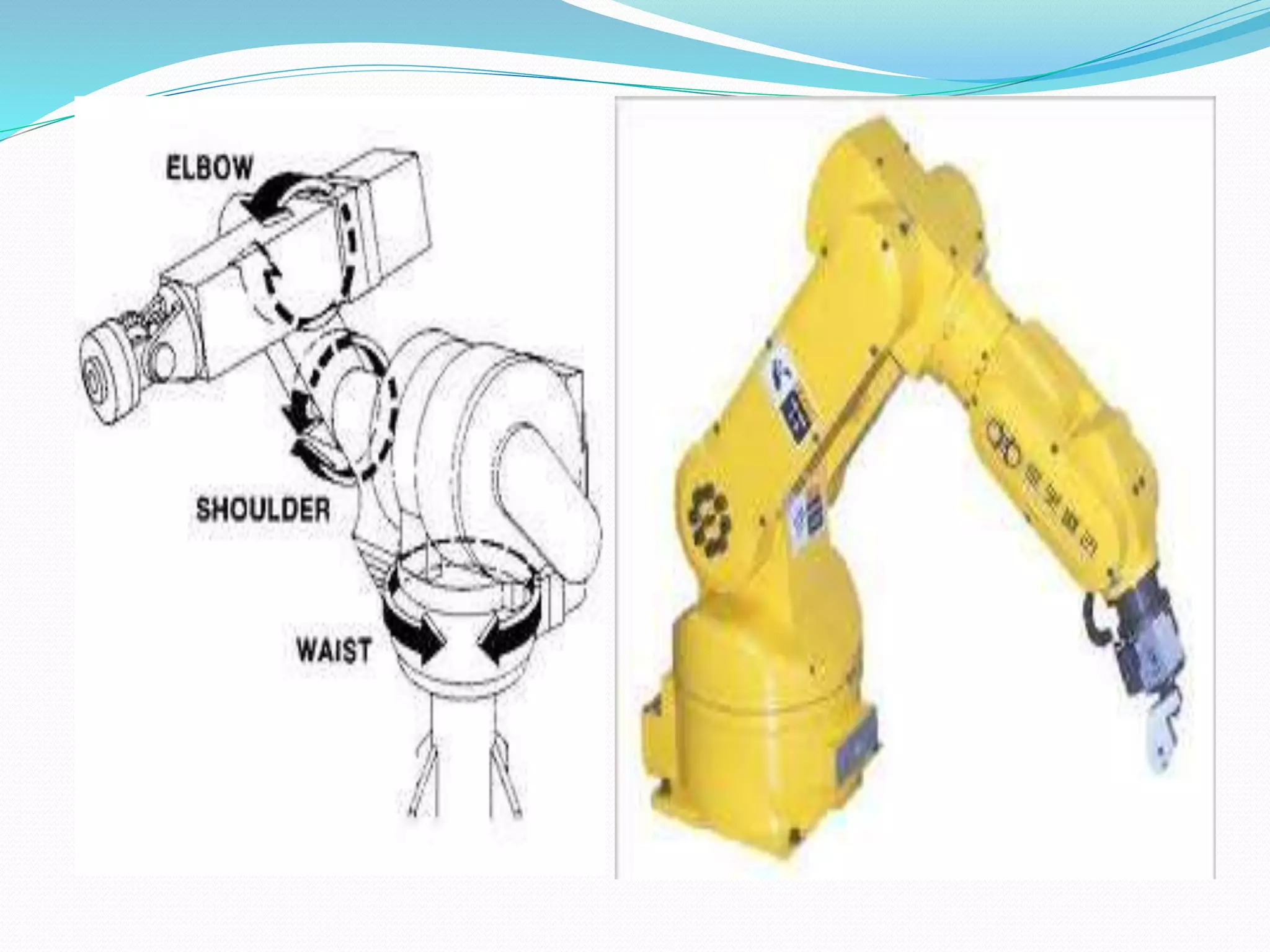 This document provides an introduction to industrial robot automation. It defines a robot and outlines the typical components of a robot including the controller, manipulator, actuator, end-effector, and sensors. The document also discusses the advantages and disadvantages of robot automation, lists the six main types of robots, and explains some common applications of robot automation in production systems such as welding, assembly, and material handling.