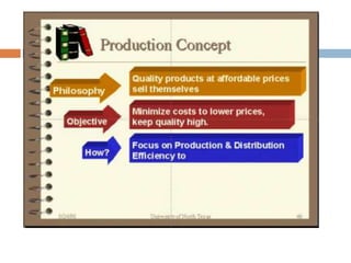 - An overview of marketing management and the production, product, selling, marketing, and societal concepts in marketing.