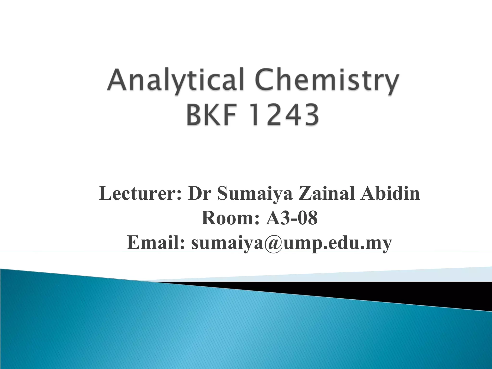 The document provides information about analytical chemistry lectures including the lecturer's contact details, lecture times, assessment breakdown, recommended textbooks, class policies, and an overview of topics to be covered in student presentations which include various analytical techniques such as gravimetric analysis, titrimetry, spectroscopy, chromatography, and mass spectrometry.