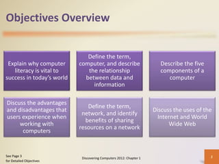 This document provides an overview of the key topics and objectives covered in Chapter 1 of Discovering Computers 2012. It defines what a computer is, describes the five main components, and discusses advantages and disadvantages of computer use. It also defines networks and the Internet, distinguishes between system and application software, and identifies different categories of computers and users. Finally, it discusses how computers are used in various sectors of society like education, healthcare, science and more.