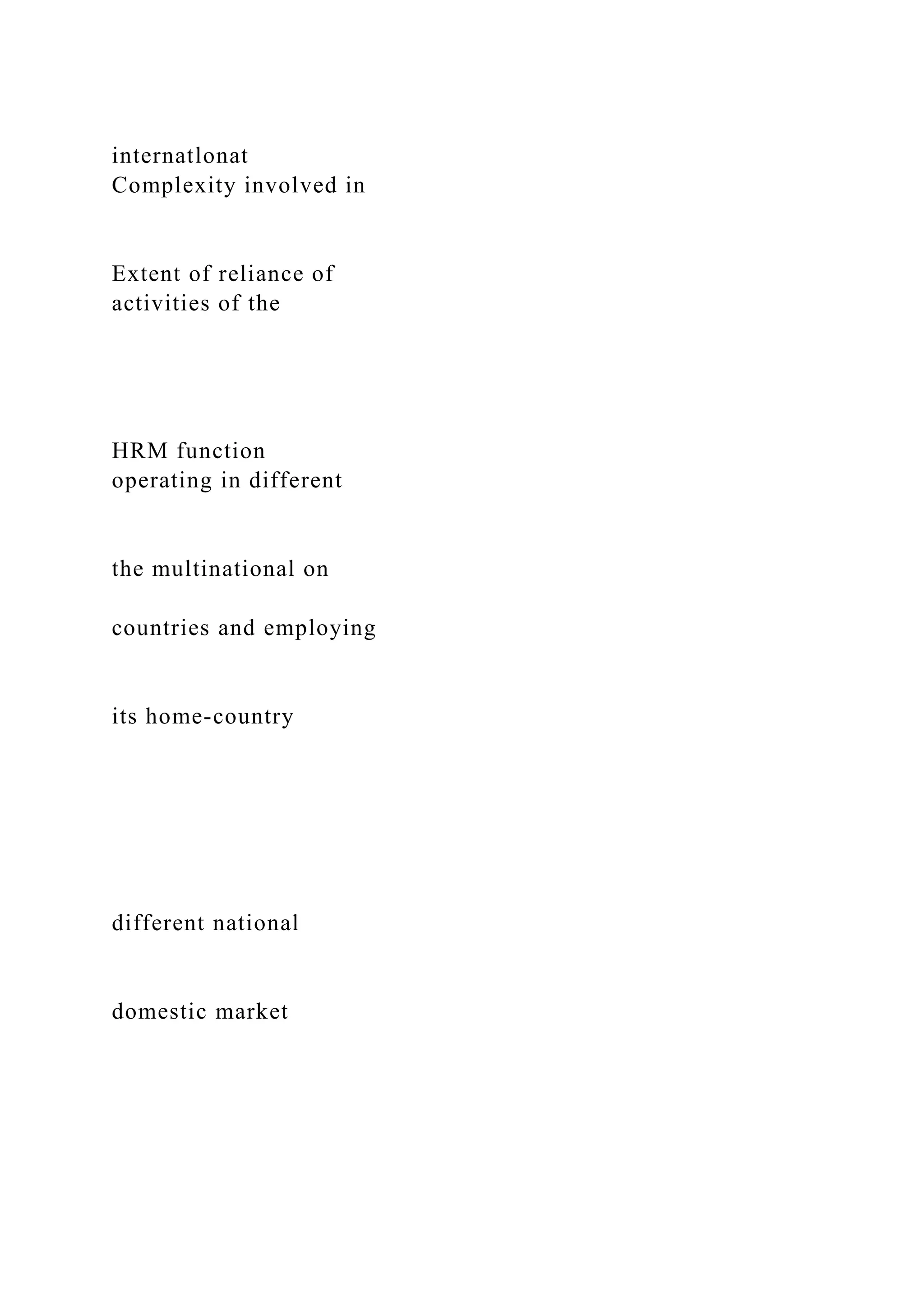 The document discusses the complexities of international human resource management (IHRM), emphasizing the significance of cultural differences and their impact on organizational practices in multinational enterprises. Challenges such as culture shock and the need for cultural sensitivity in hiring and management practices are highlighted, alongside differentiation between multidomestic and global industries. The text also suggests strategies for HR managers to navigate cultural variances while maintaining a competitive advantage in the global market.