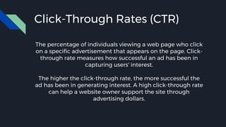 The document defines key marketing terms: click-through rate measures user interest in ads, cost per click bills advertisers per click, return on investment evaluates profit relative to cost, and cost of ignoring calculates lost revenue from neglecting social media. It also lists the members of a team - Paige Bollman, Asiana Hung-Barnes, Susan Morales, Julia Ramirez-Vaughan.