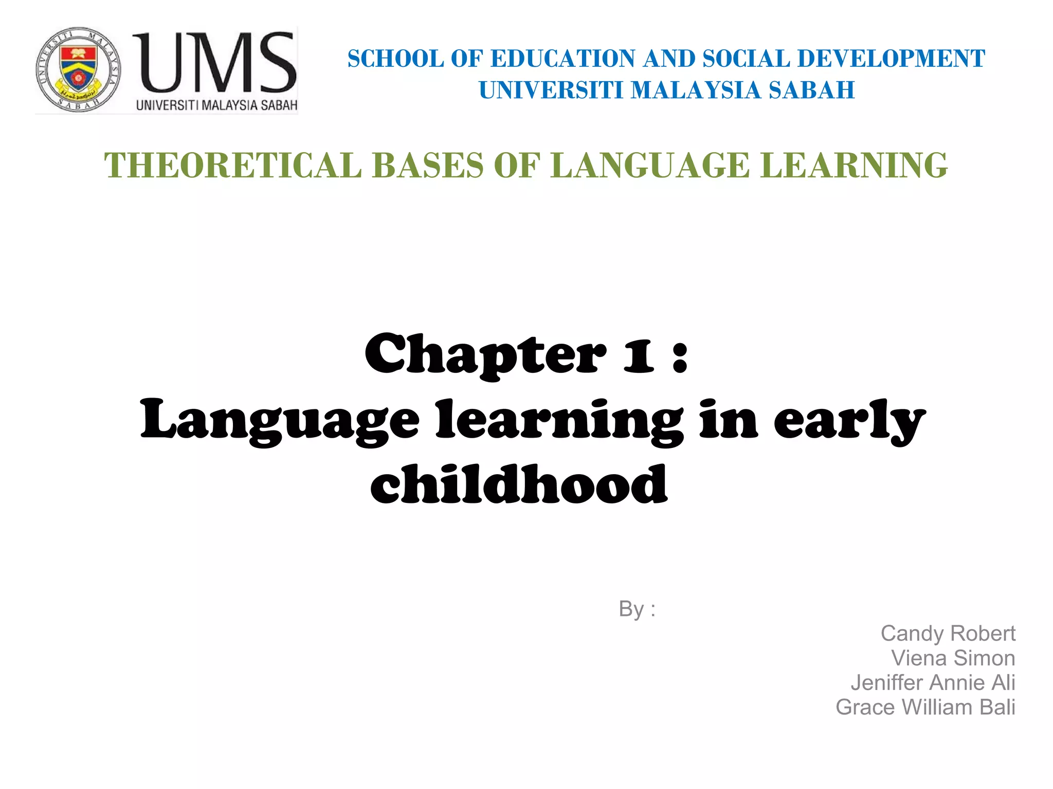 This chapter discusses language learning in early childhood. It covers topics such as first language acquisition milestones in the first three years including negation and question formation. It also discusses language development in pre-school and school-aged children. The chapter examines theoretical perspectives on first language acquisition such as behaviorist, innatist and interactionist views. It further discusses language disorders and delays in children as well as childhood bilingualism.