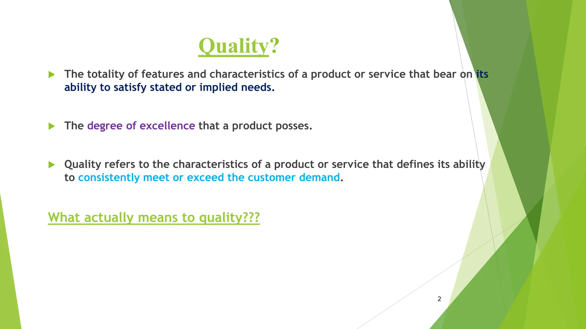 This document discusses key concepts related to quality and quality control. It defines quality as the characteristics of a product or service that determine its ability to meet customer demands. Aspects of quality include performance, conformance, reliability, durability, innovative features, serviceability, ease of use, and aesthetics. Factors that affect quality are the customer, processes, employees, and materials/suppliers. Poor quality can lead to lower productivity, material loss, loss of business, and liability issues. Quality control involves checking and regulating quality through verification activities, while quality assurance focuses on preventing defects through proactive processes and audits.
