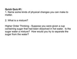 This document discusses physical and chemical changes, states of matter, and phase changes. It defines a physical change as a change in size, shape, or state of matter without changing the type of matter. A mixture is two or more types of matter placed together where each type can be separated. Dissolving sugar in hot water creates a solution, not a mixture, since the sugar cannot be easily separated from the water. The document also defines the three states of matter - solid, liquid, and gas - and describes phase changes like evaporation and condensation that occur through heating and cooling.