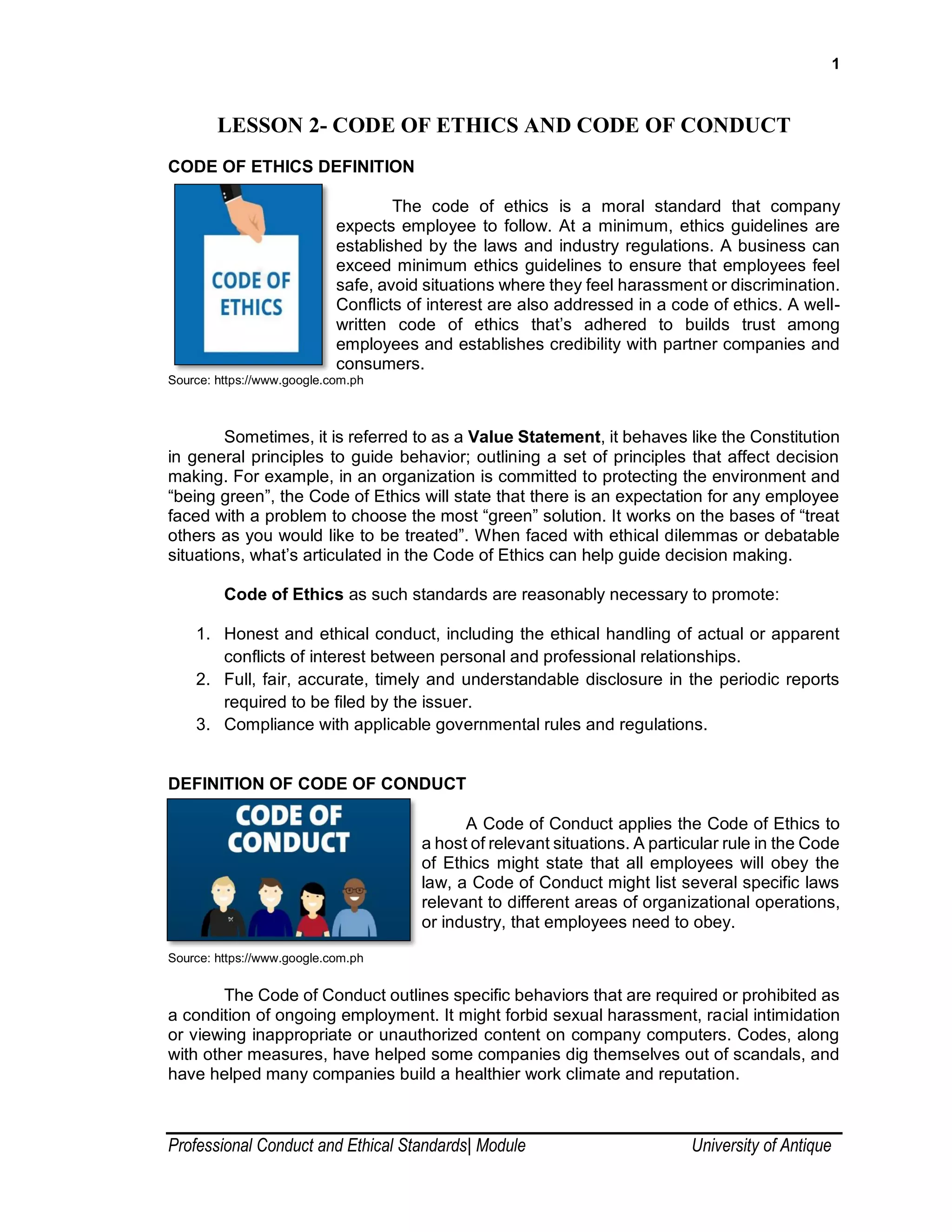This document discusses codes of ethics and codes of conduct. It defines a code of ethics as a set of moral standards that guide employee behavior and decision-making. A code of conduct provides more specific guidelines about required and prohibited workplace behaviors. While a code of ethics focuses on values and principles, a code of conduct outlines rules for appropriate actions. Maintaining strong codes of ethics and conduct helps build trust within an organization and credibility with external partners and customers.