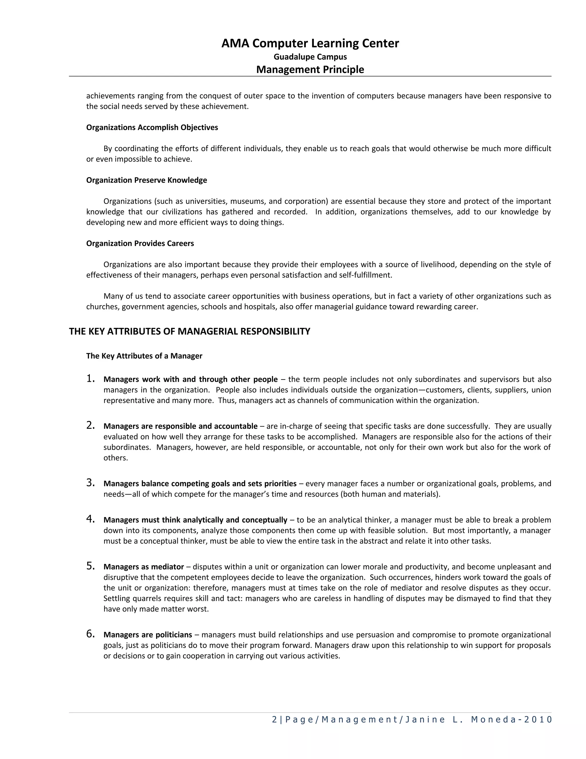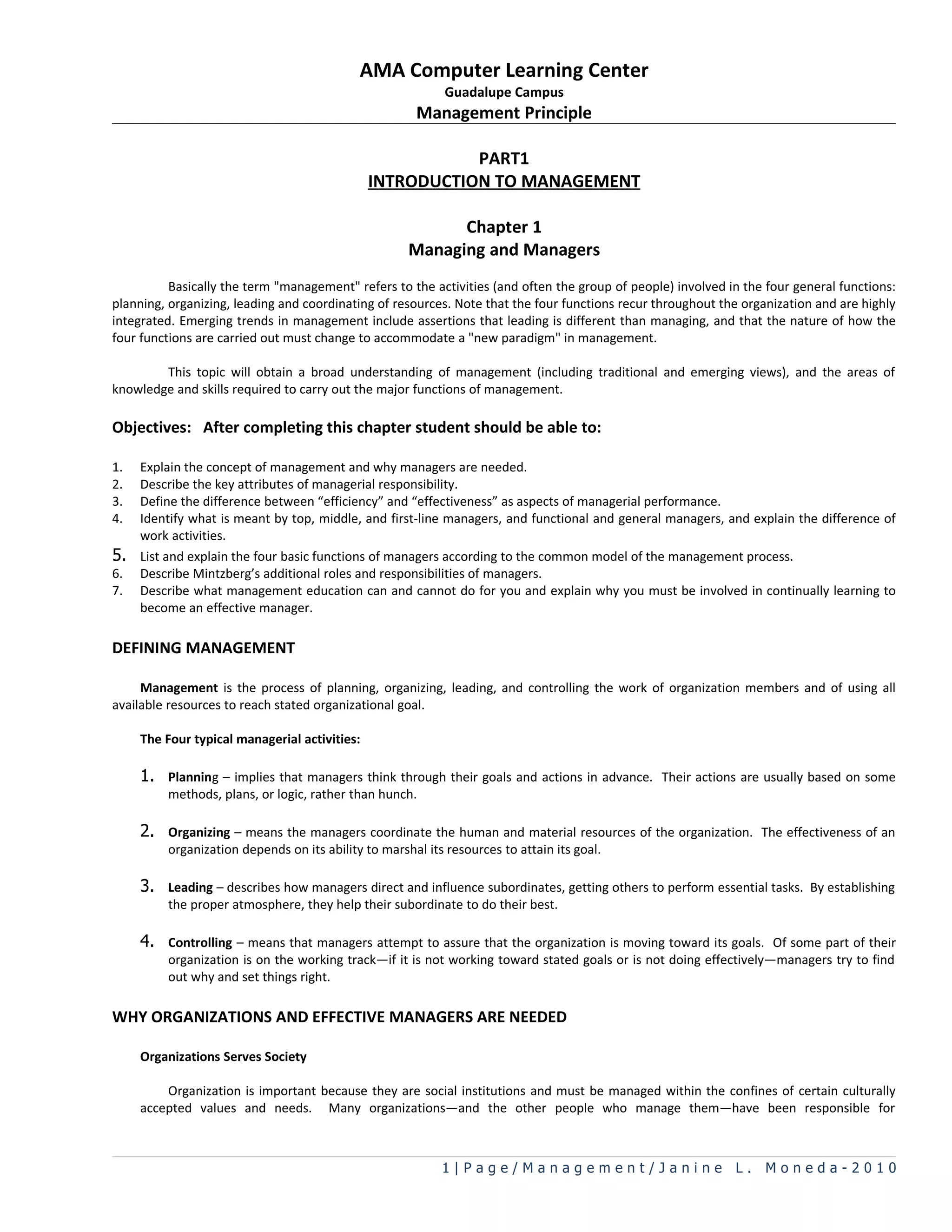 The document provides an overview of management principles, outlining the four key functions of management: planning, organizing, leading, and controlling. It discusses the importance of managerial roles, the distinction between efficiency and effectiveness, and the different levels and types of managers, emphasizing the responsibility of managers in achieving organizational goals. Additionally, it highlights the significance of ethical behavior in management and the evolving nature of management practices in response to societal needs.