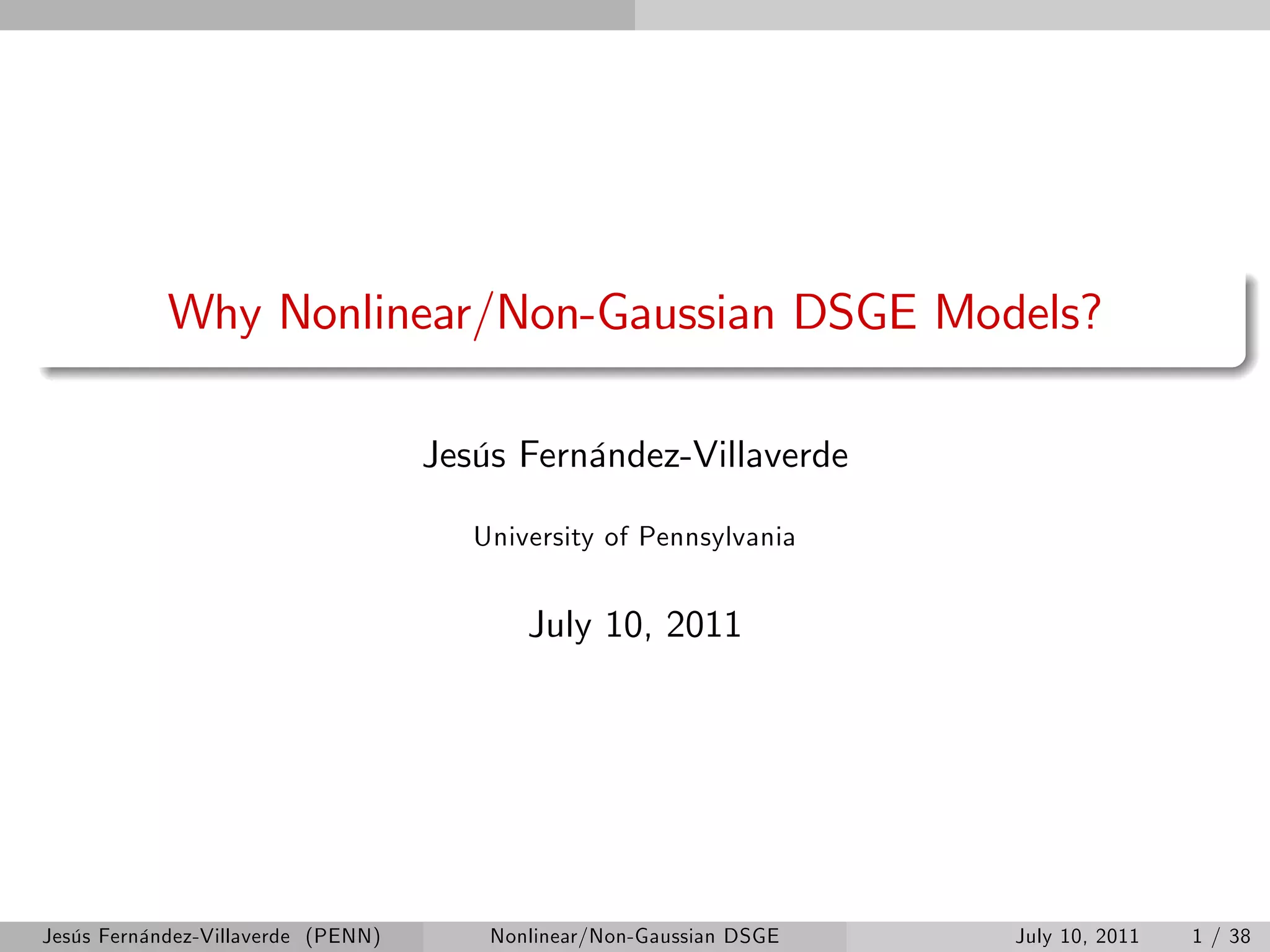 The document discusses three examples of nonlinear and non-Gaussian DSGE models. The first example features Epstein-Zin preferences to allow for a separation between risk aversion and the intertemporal elasticity of substitution. The second example models volatility shocks using time-varying variances. The third example aims to distinguish between the effects of stochastic volatility ("fortune") versus parameter drifting ("virtue") in explaining time-varying volatility in macroeconomic variables. The document outlines the motivation, structure, and solution methods for these three nonlinear DSGE models.