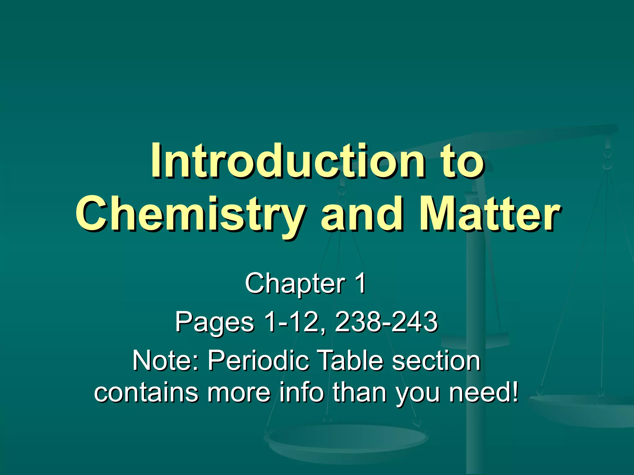 This document provides an introduction to chemistry and matter. It discusses that chemistry is the study of matter and its properties. There are several branches of chemistry including organic, inorganic, physical, analytical, biochemistry, and theoretical chemistry. Matter can exist in solid, liquid, or gas states depending on the closeness and movement of its particles. A substance's properties, whether physical or chemical, can help identify it. Changes to matter can be physical, chemical, or nuclear, altering its identity or structure on different levels, while conserving total mass and energy.