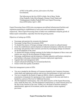 Export Processing Zones (EPZs) are designated industrial estates established by governments to promote exports by providing tax incentives and streamlined regulations. EPZs aim to attract foreign investment by offering a duty-free environment for production and export. India first established EPZs in the 1970s to boost exports and employment. EPZs offer benefits like developed infrastructure, tax exemptions, and customs clearance facilities. A three-tier management system oversees their functioning. EPZs allow import/procurement of raw materials, capital goods, and office equipment duty-free to enable export production at low cost.
