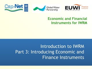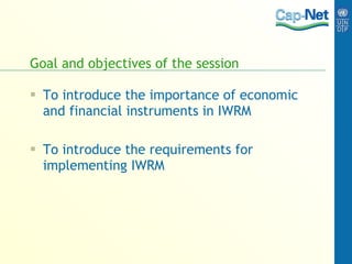 This document introduces economic and financial instruments for integrated water resources management (IWRM). It defines economics as allocating scarce resources, and finance as maximizing returns on assets/investments. Economic instruments for IWRM include water tariffs, abstraction charges, subsidies, and taxes. Financial instruments include water tariffs, government grants/loans, external grants/loans, and commercial loans. Implementing IWRM faces roadblocks like sectoral interests and socio-cultural myths. An incremental approach is needed to negotiate differences, integrate sectors, and reform institutions and laws to sustainably finance IWRM plans.
