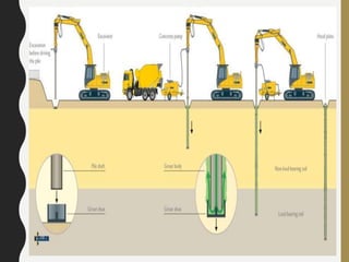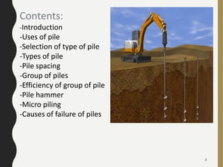 - Piles are selected based on factors like soil properties, loading conditions, costs, and availability of materials. Proper pile type and design are necessary to safely support structures.
