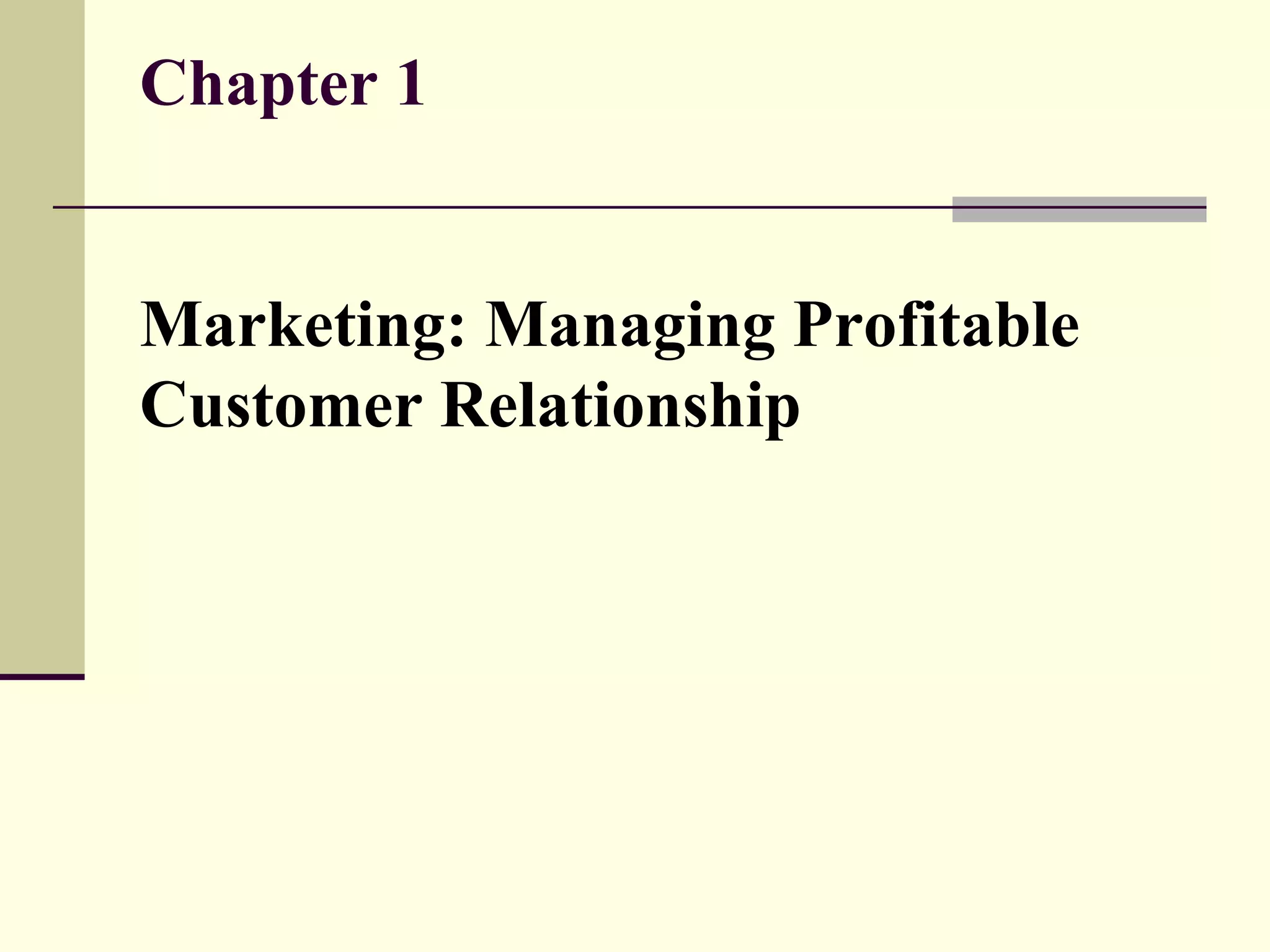 The document discusses key concepts in marketing such as defining marketing as creating value for customers to build relationships and capture value in return. It outlines the marketing process of understanding customer needs, designing a customer-driven strategy, creating value, building relationships, and capturing value from customers to create profits. The document also compares different organizational concepts in marketing like production, product, and selling concepts, and emphasizes that the marketing concept of knowing customer needs and satisfying them better than competitors is most effective.