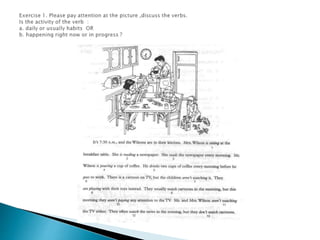 1. The document discusses the simple present and present progressive tenses in English. It provides examples of how each is used and explains the differences between them.