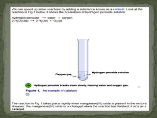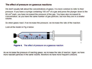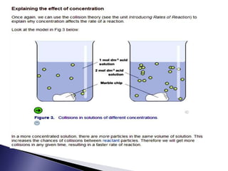 Rate of reaction is defined as the change in quantity of reactants or products per unit time. The average rate is calculated over an interval of time, while the instantaneous rate is the actual rate at a given time. Several factors affect the rate of reaction, including the total surface area and concentration of reactants, temperature, use of catalysts, and pressure for gaseous reactants. According to collision theory, the rate of reaction depends on the frequency and effectiveness of collisions between reactant particles, which must achieve the minimum activation energy and correct orientation.