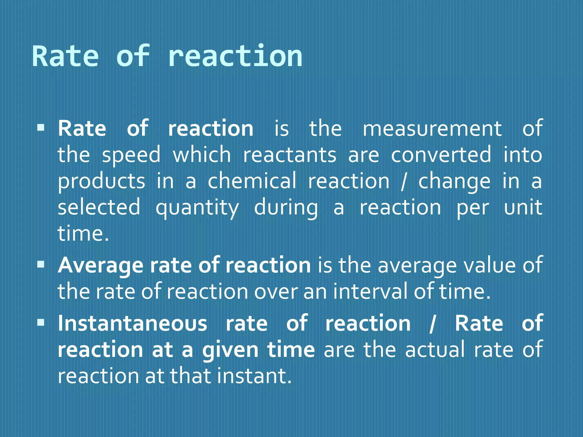Rate of reaction is defined as the change in quantity of reactants or products per unit time. The average rate is calculated over an interval of time, while the instantaneous rate is the actual rate at a given time. Several factors affect the rate of reaction, including the total surface area and concentration of reactants, temperature, use of catalysts, and pressure for gaseous reactants. According to collision theory, the rate of reaction depends on the frequency and effectiveness of collisions between reactant particles, which must achieve the minimum activation energy and correct orientation.