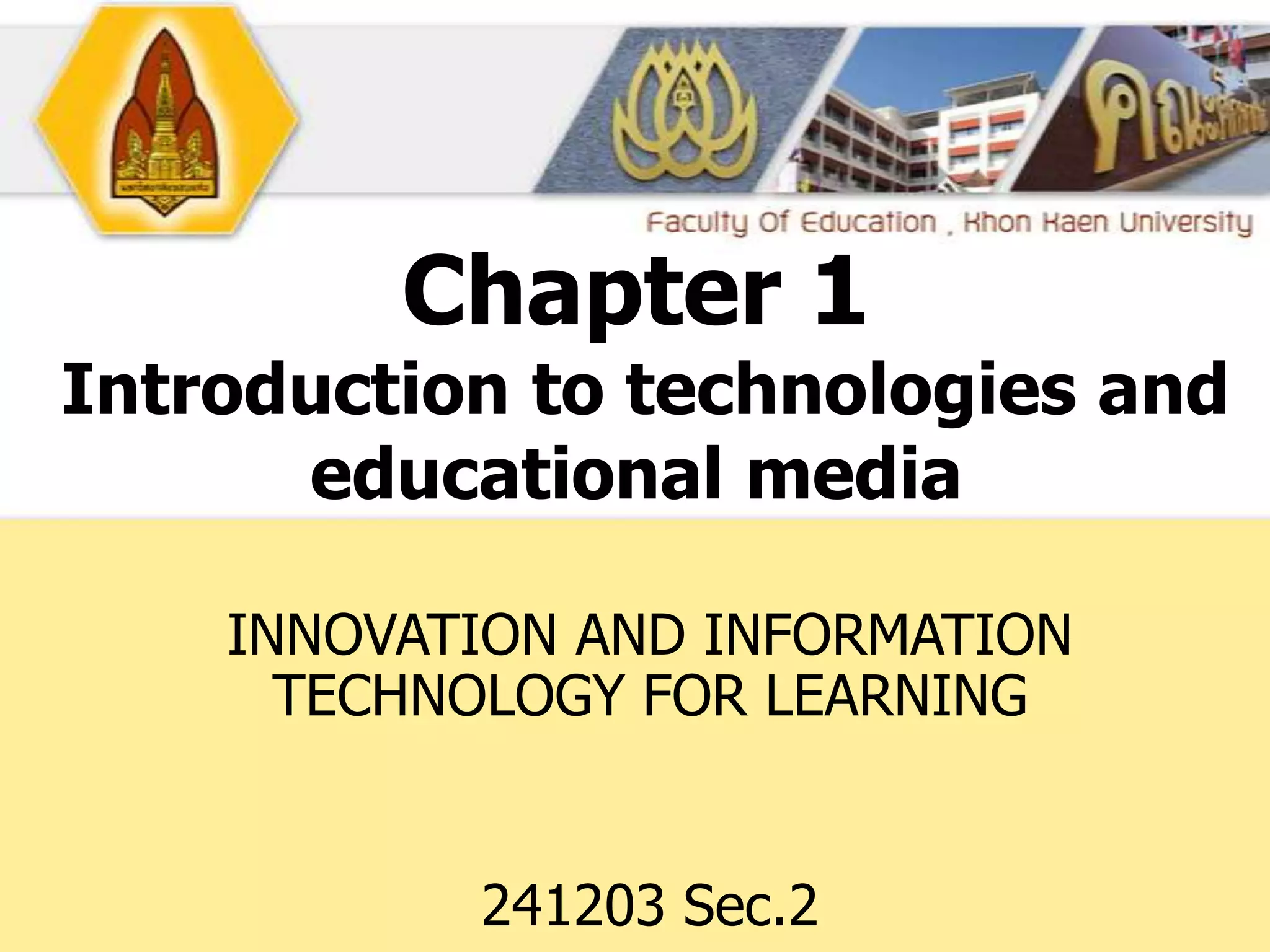 This chapter introduces educational and instructional technologies. It discusses how technology has evolved from visual aids in the 1950s-1960s to include computers, tablets, and online learning from the 1970s onward. The chapter also outlines five components of educational technology: design, development, utilization, management, and evaluation. Instructional technology aims to improve the efficiency, effectiveness, and economy of learning while maintaining safety.