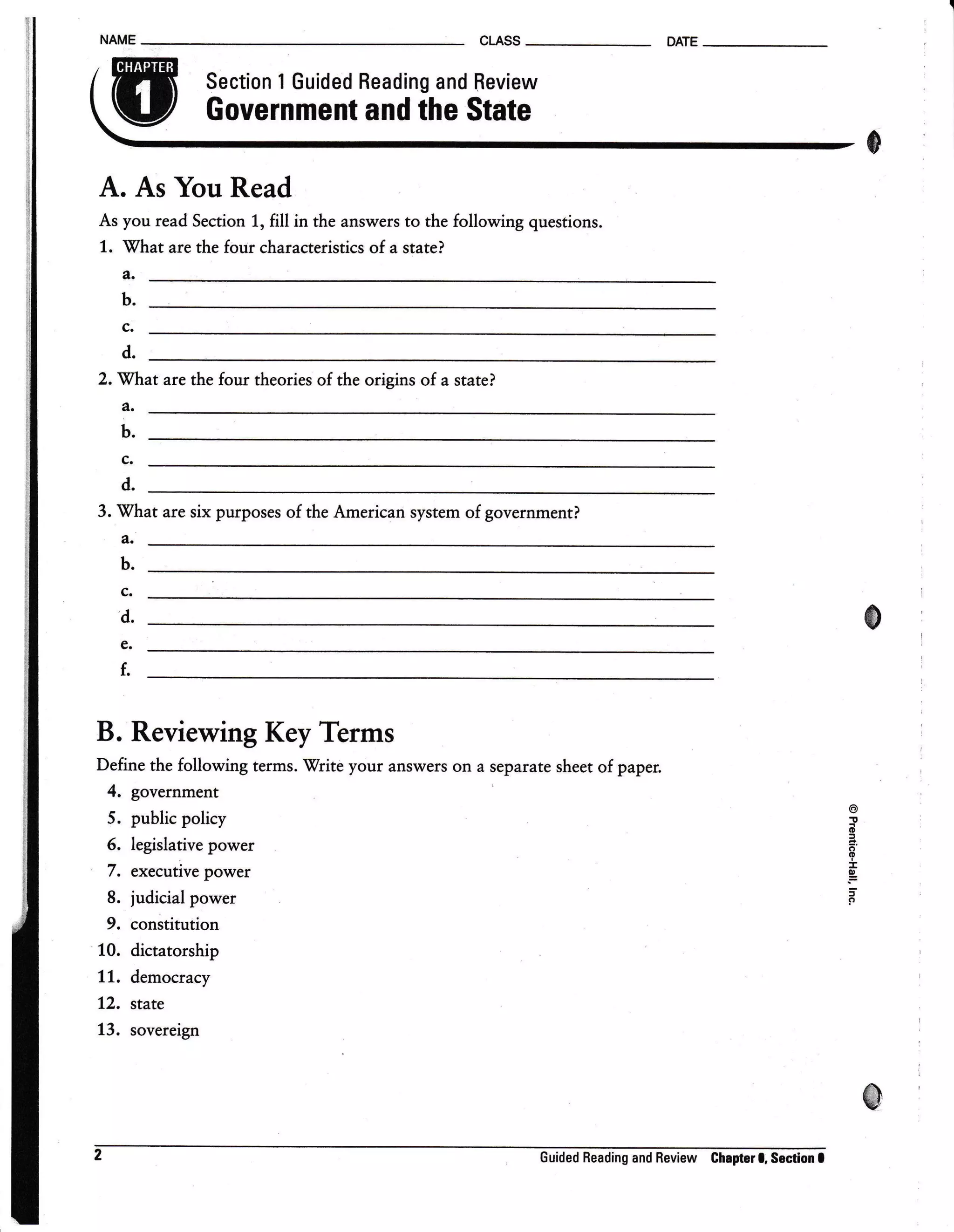 This document provides guided questions and terms for a student to fill out as they read a text on government and the state. It asks the student to identify the four characteristics of a state, the four theories of the origins of a state, and six purposes of the American system of government. It also provides key terms for the student to define related to forms of government, the three powers, and political concepts like constitution, dictatorship, democracy, and state.