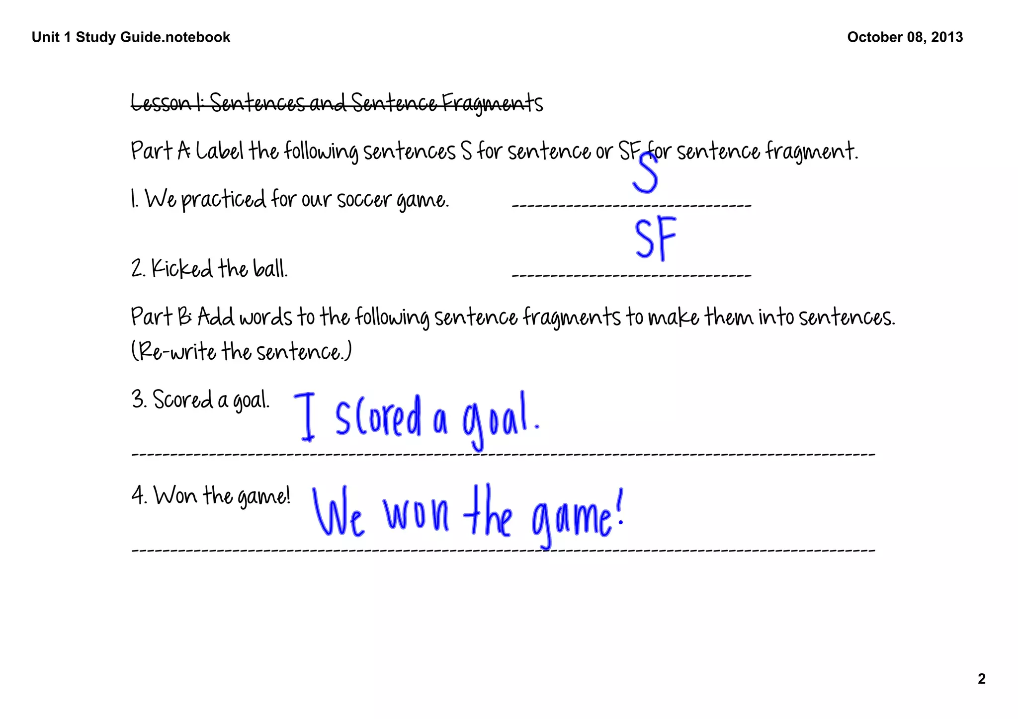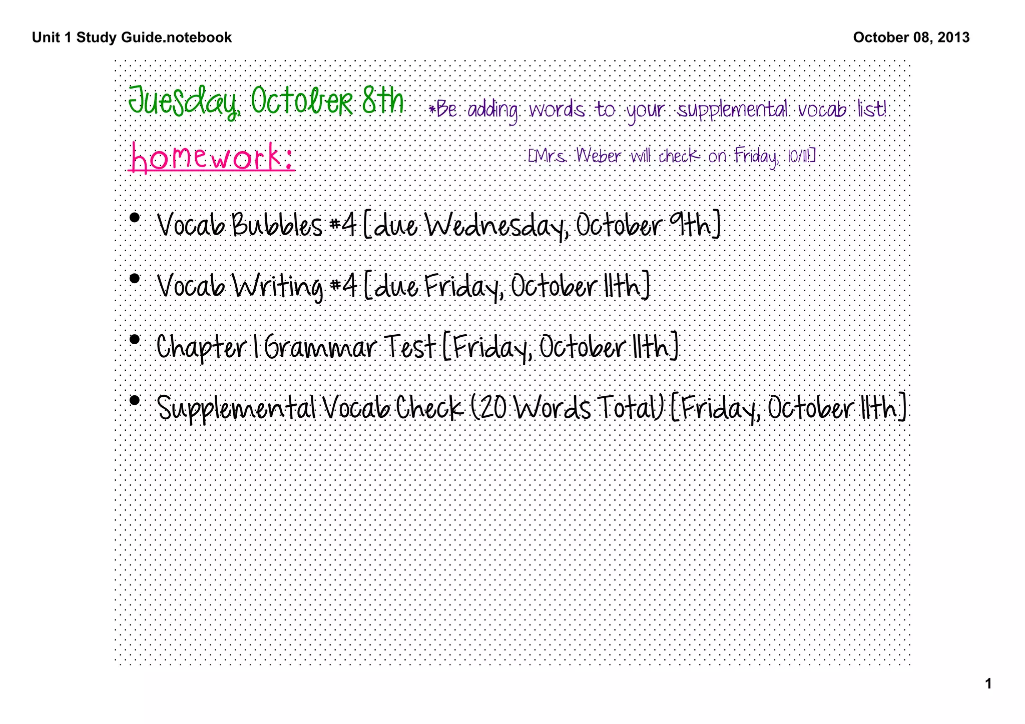 This document provides a study guide for a grammar unit with lessons on sentences, sentence types, combining sentences, punctuation, subjects, predicates, and run-on sentences. It includes examples to label, combine, punctuate, underline subjects and predicates in, and correct run-on sentences. Homework includes vocabulary bubbles, writing, a grammar test, and a supplemental vocab check due on October 11th.