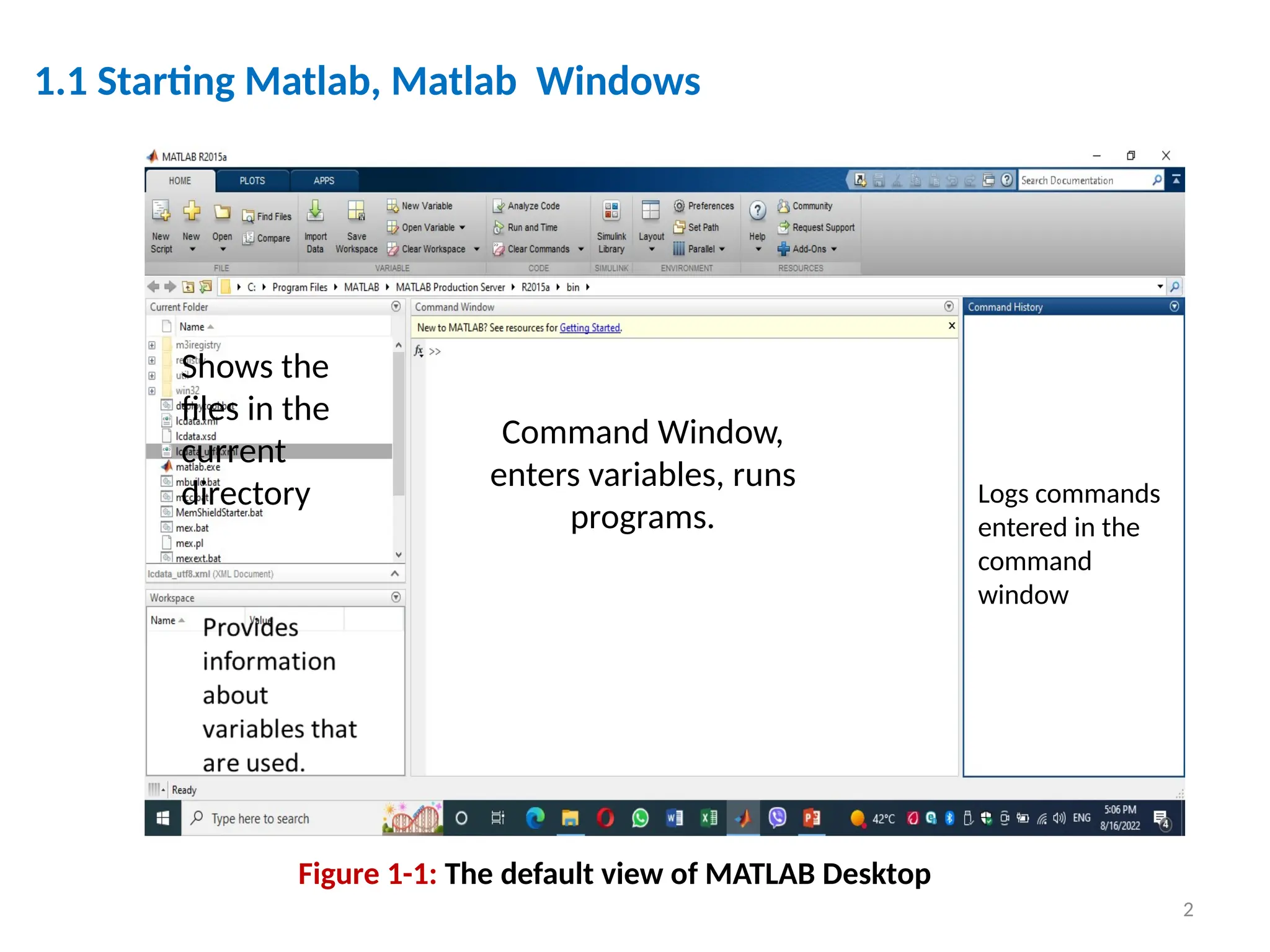 The document is a tutorial on using MATLAB, covering the command window, variable definitions, and arithmetic operations. It includes details on executing commands, recalling previous commands, and a list of reserved keywords. Additionally, it describes useful commands and elementary math built-in functions within MATLAB.