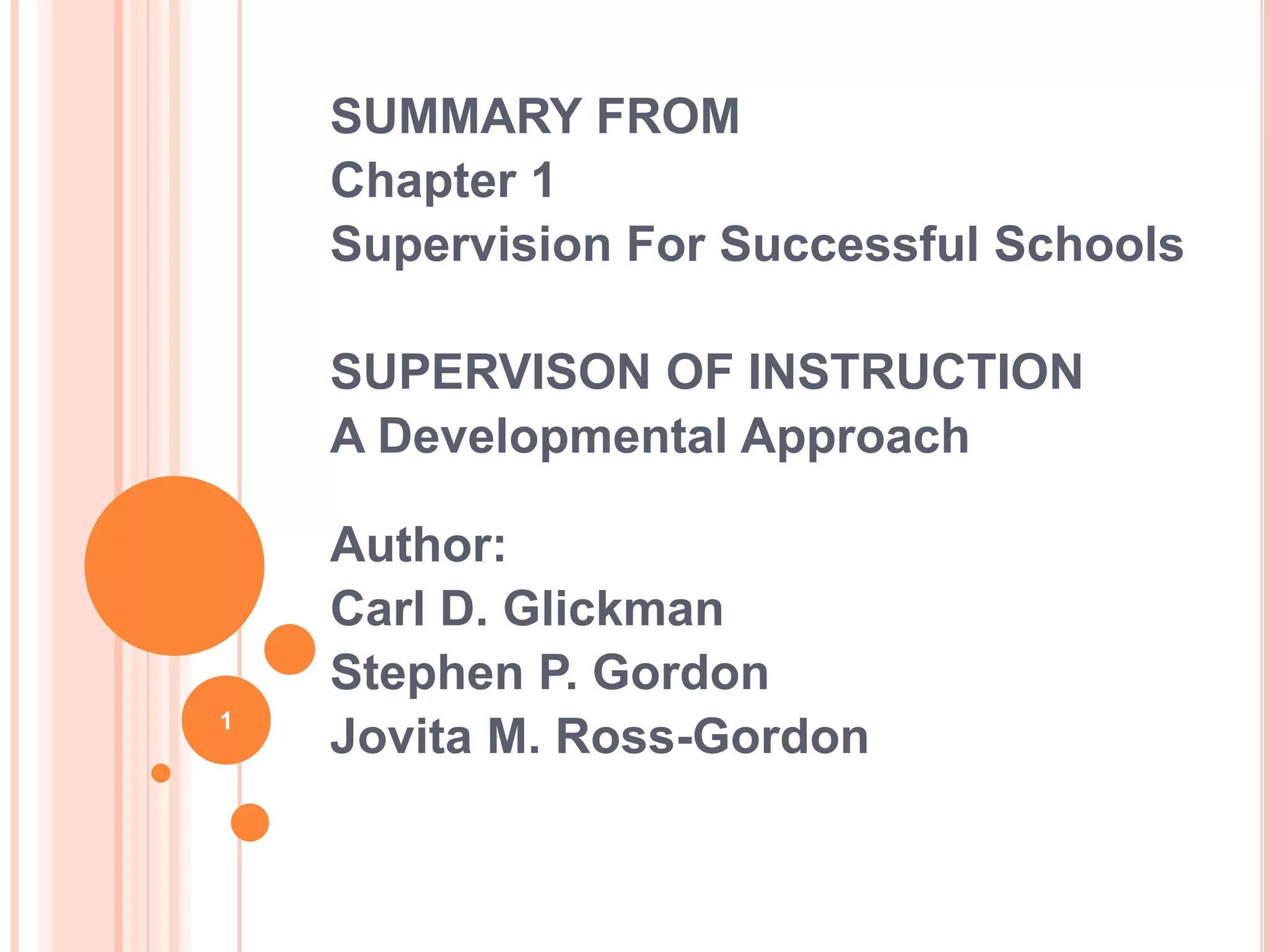 The document summarizes Carl Glickman's framework for instructional supervision. It outlines three types of schools: conventional (dependent and hierarchical), congenial (friendly but isolated), and collegial (focused on improving teaching and learning). Successful schools create "SuperVision" through instructional leadership focused on developing a shared mission and engaging teachers in decision-making. Effective supervision requires knowledge, interpersonal skills, and technical expertise to support teachers through tasks like professional development, curriculum planning, and action research. The goal is shifting from conventional control of teachers to a collaborative, growth-oriented approach focused on student achievement in a democratic society.