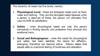 The document discusses the concept of the human person, emphasizing self-image, characteristics, and pivotal components that define human identity. It outlines the importance of human relationships, individual uniqueness, and the core values that contribute to personal growth and societal interaction. Additionally, it presents principles for successful living and building positive human relations, highlighting the significance of a positive mental attitude.