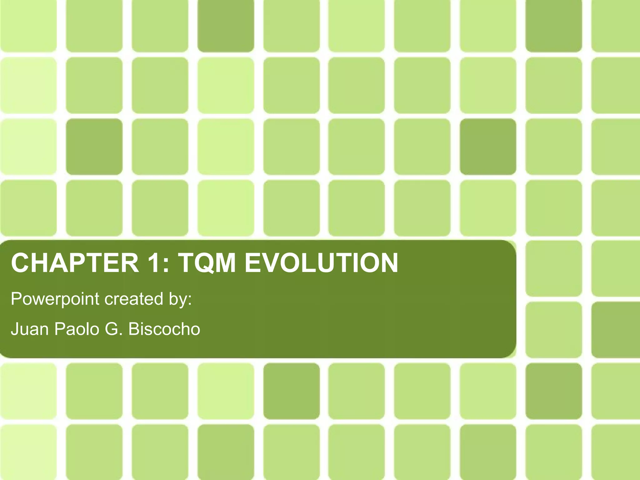 This document provides an overview of the evolution of total quality management (TQM). It discusses definitions of quality, key quality thinkers like Deming and Juran, and the historical development of quality approaches. The Japanese adoption of quality principles in the 1950s led to their economic rise over American companies. This prompted the development of TQM, which integrates quality principles throughout management systems. The document outlines Deming's 14 points and Juran's quality trilogy, which were influential quality frameworks.