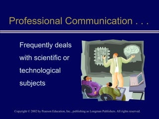 The document discusses professional communication, noting that it frequently deals with scientific or technological subjects and must meet the information needs of the audience, use specialized vocabulary, have a helpful design, and include illustrations. Workplace writing includes various types of correspondence, manuals, proposals, reports, policies and procedures, job descriptions, performance evaluations, and promotional materials. Professional communication fails when the focus is on what the writer wants to say rather than the needs of the readers or listeners. Ineffective professional communication can waste time, increase expenses, cause missed deadlines, decrease productivity, affect promotions, hurt morale, and damage reputations, while effective professional communication can save time, save money, achieve its purpose, and enhance one's career.