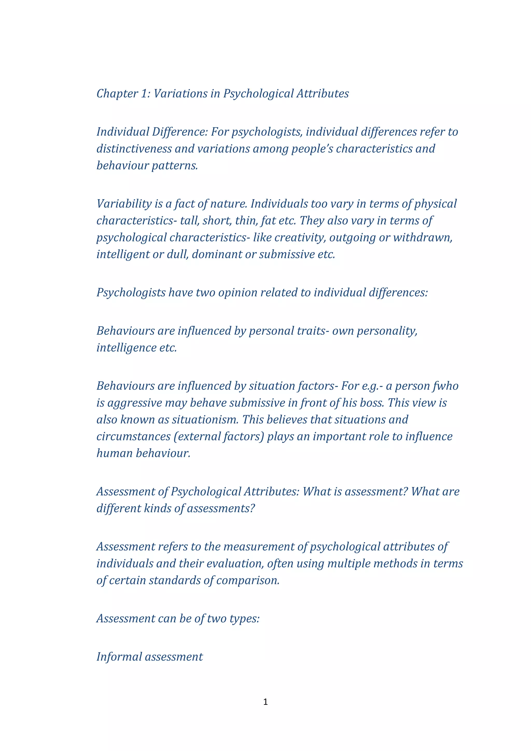 This document discusses theories of intelligence and psychological assessment. It begins by defining individual differences and explaining that psychologists study variability in physical and psychological traits. It then discusses two views on what influences behavior - personal traits or situational factors. Next, it defines assessment and describes informal and formal methods. It provides examples of psychological attributes assessed, like intelligence, aptitude, interests, and personality. Finally, it summarizes several theories of intelligence, including psychometric, information processing, and multiple intelligences approaches.