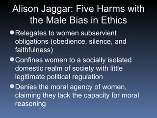 This document discusses different perspectives on gender and ethics. It describes how traditional male-centered ethics have ignored the female perspective and marginalized women. It also examines key debates around whether men and women differ psychologically and morally, including views that women are naturally subordinate, that they exist to please men, or that basic human capacities are gender-neutral. More recent approaches emphasize an ethics of care that values relationships and context over impartial rules.