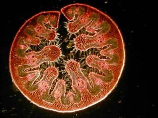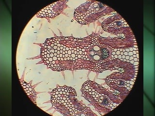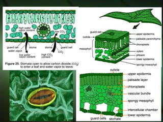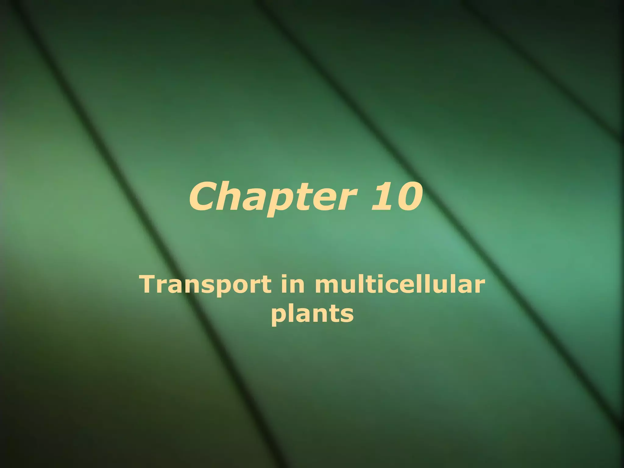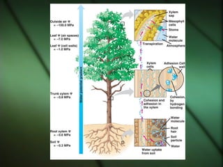 The document discusses the transport systems in plants, explaining that multicellular plants require oxygen, carbon dioxide, water, and nutrients delivered through their vascular tissues. It focuses on the transport of water, describing how water moves from the soil through the roots and xylem tissue up to the leaves, where it is released through transpiration. The transport of water establishes pressure gradients and flow that also facilitates the transport of minerals throughout the plant.