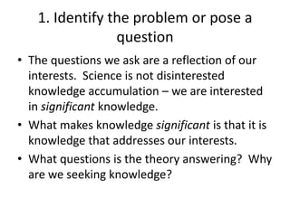 This document discusses the scientific method and criteria for judging scientific theories. It outlines the key steps of the scientific method as: 1) identifying a problem or question, 2) devising a hypothesis, 3) deriving a test implication, 4) performing a test, and 5) accepting or rejecting the hypothesis. Additional criteria for judging theories discussed include testability, fruitfulness, scope, simplicity, and conservatism. Common mistakes in assessing "weird" theories are also summarized, such as leaping to strange conclusions without considering natural explanations or confusing what seems possible with what is actually possible.