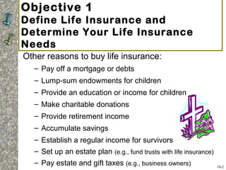 This document discusses life insurance, including its primary purposes of protecting dependents from financial loss due to death and reducing survivors' financial burdens. It defines life insurance as a policy purchased from an insurance company that pays a lump sum death benefit to beneficiaries upon the policy holder's death. The document provides information on determining life insurance needs, the types of life insurance companies and policies, key policy provisions, and factors to consider when buying a policy. It also discusses annuities and how they can provide financial security and supplement retirement income.